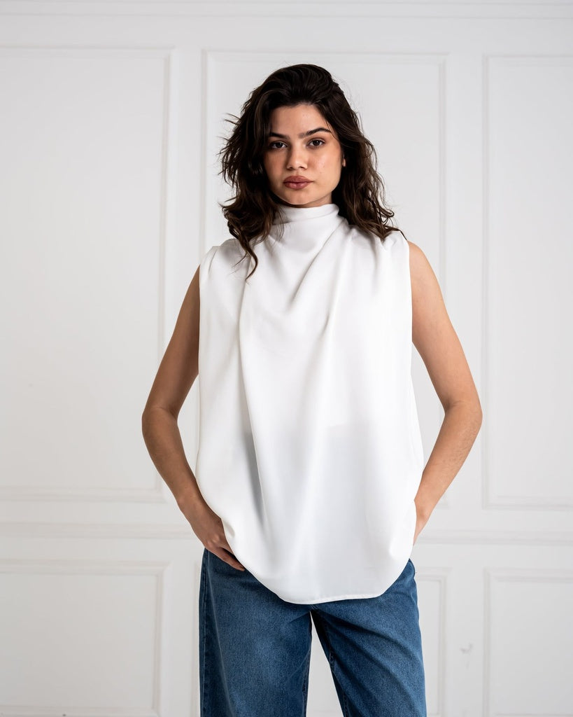 This sleeveless, draped crepe top in timeless off-white features a graceful, draped front and a high neckline, creating a modern and sophisticated silhouette. Crafted from lightweight crepe fabric, it offers a soft, fluid feel that moves beautifully with every step. Perfect for pairing with tailored trousers, denim, or a sleek skirt, this top transitions seamlessly from day to night.