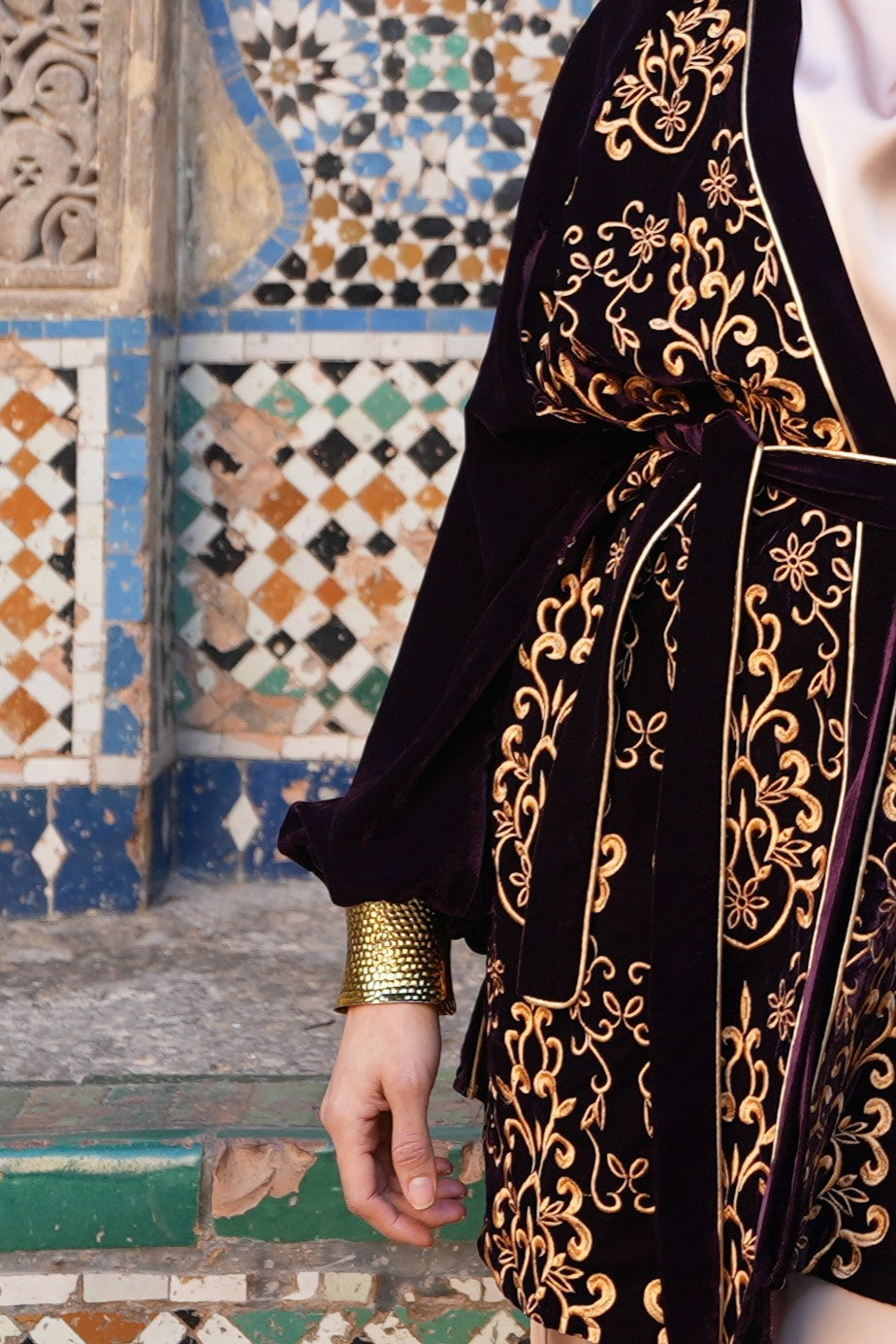 - Velvet fabric with embroidered detailing