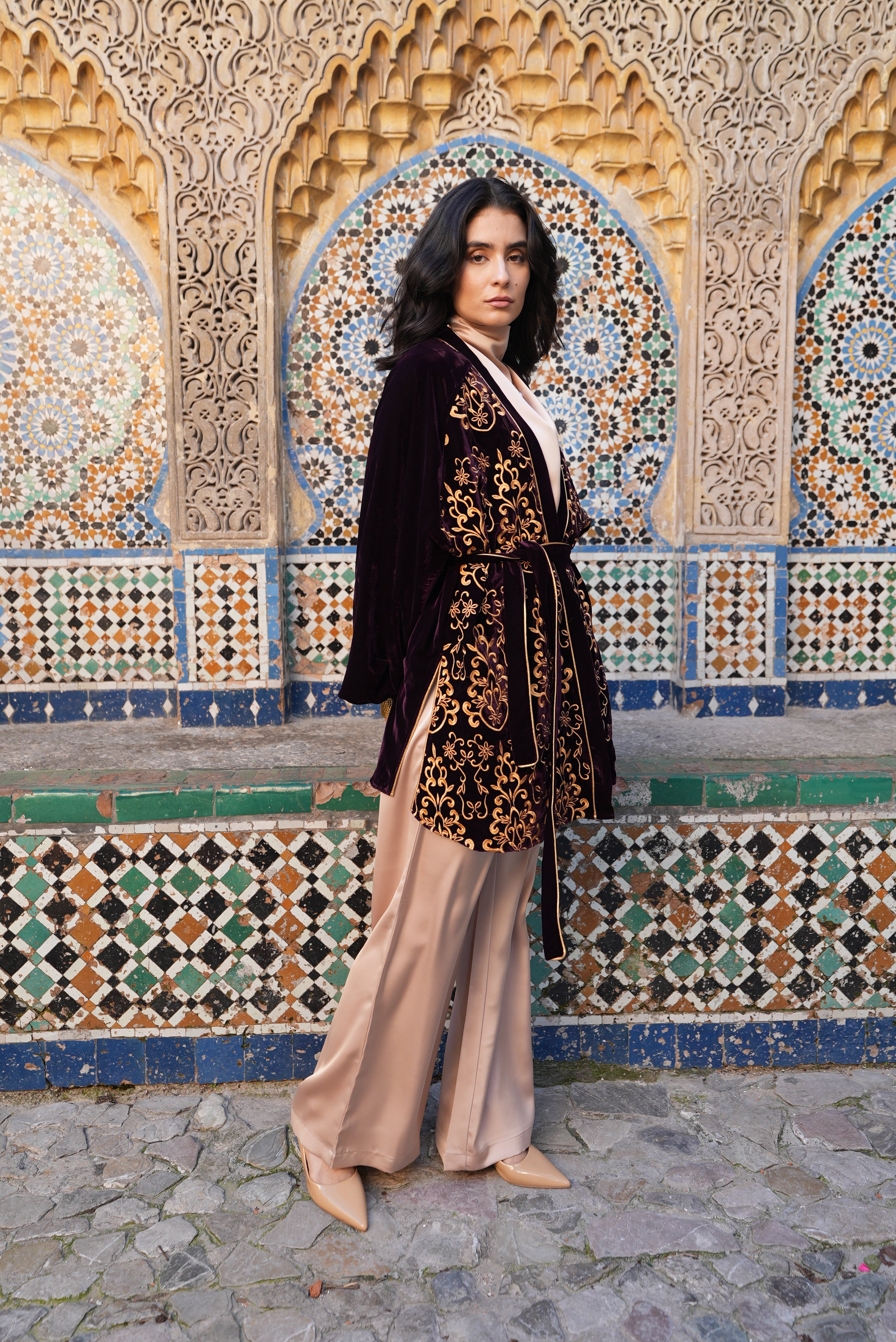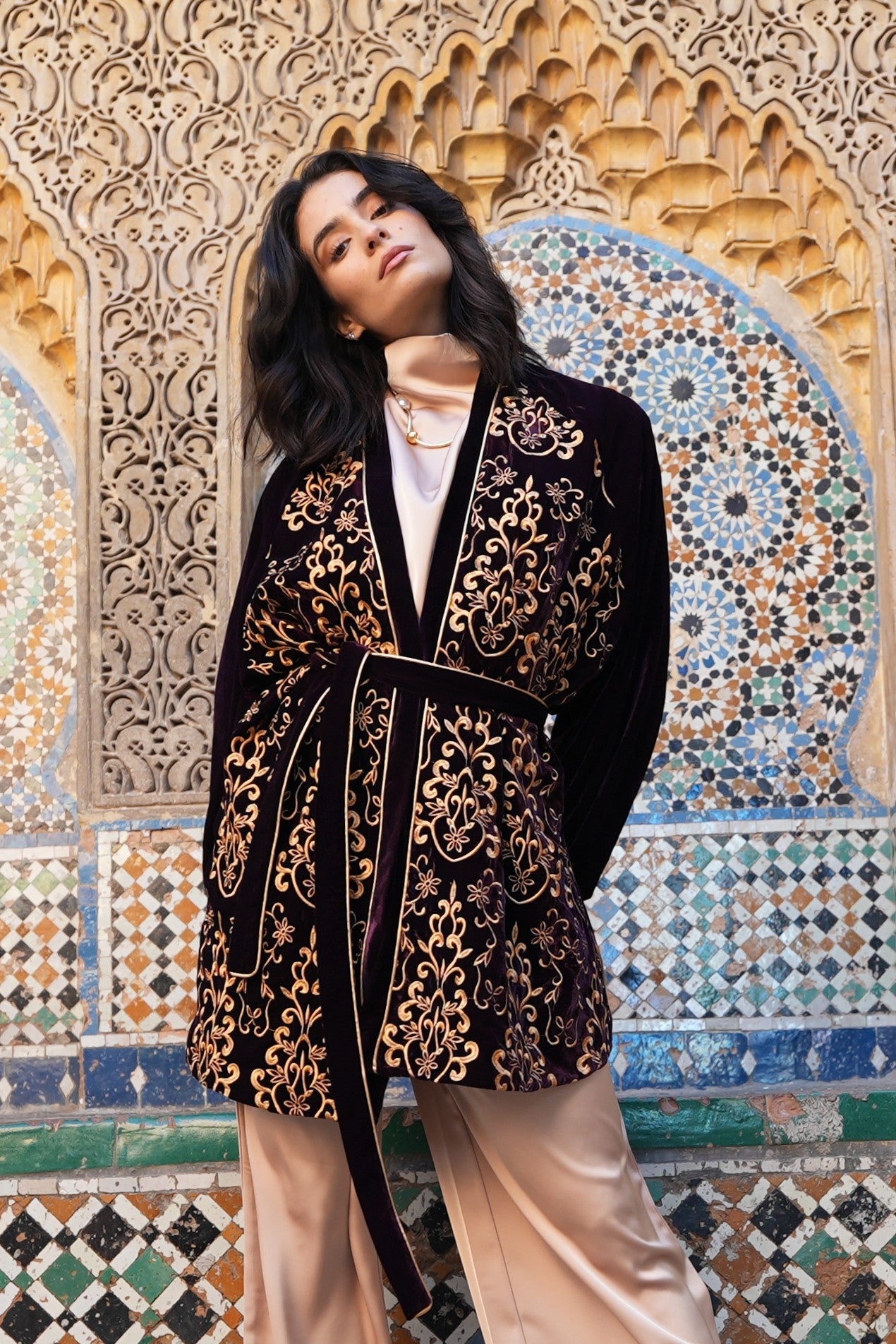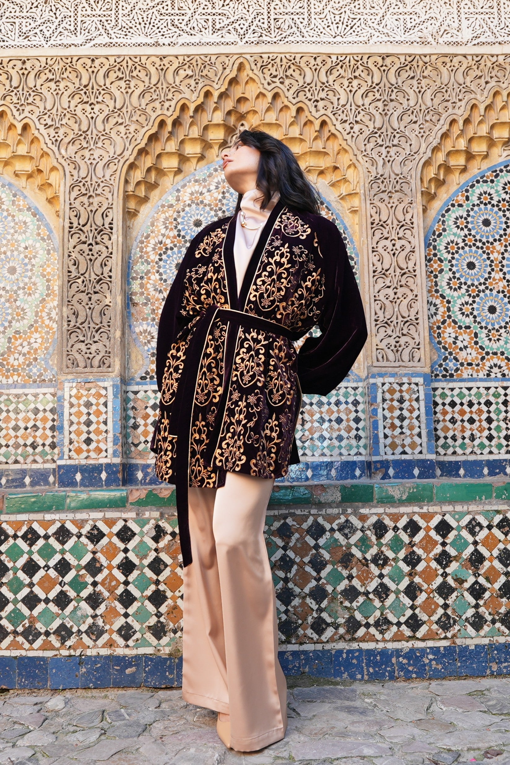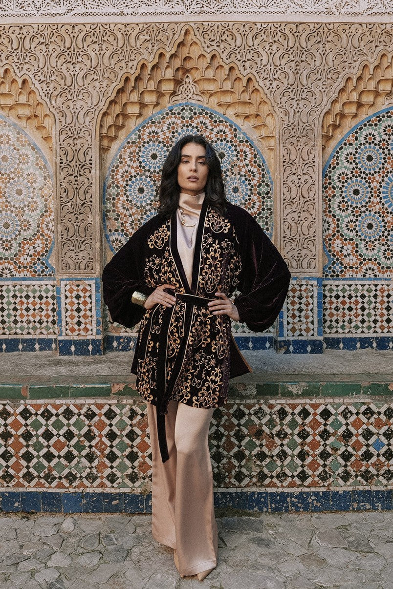 Fabric: Luxurious velvet cardigan featuring heavy front embroidery, fully lined with chiffon at the front for added structure and comfort.