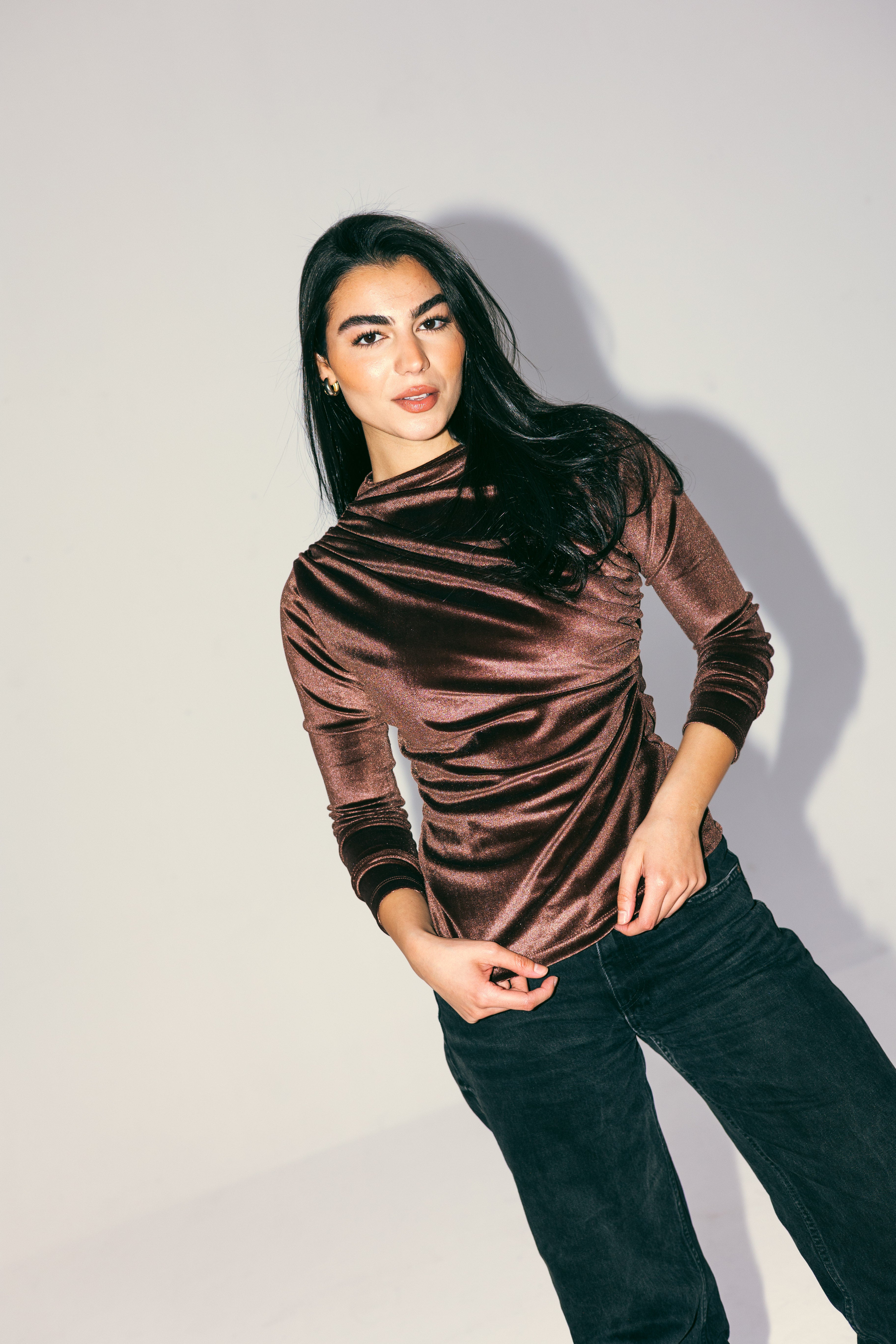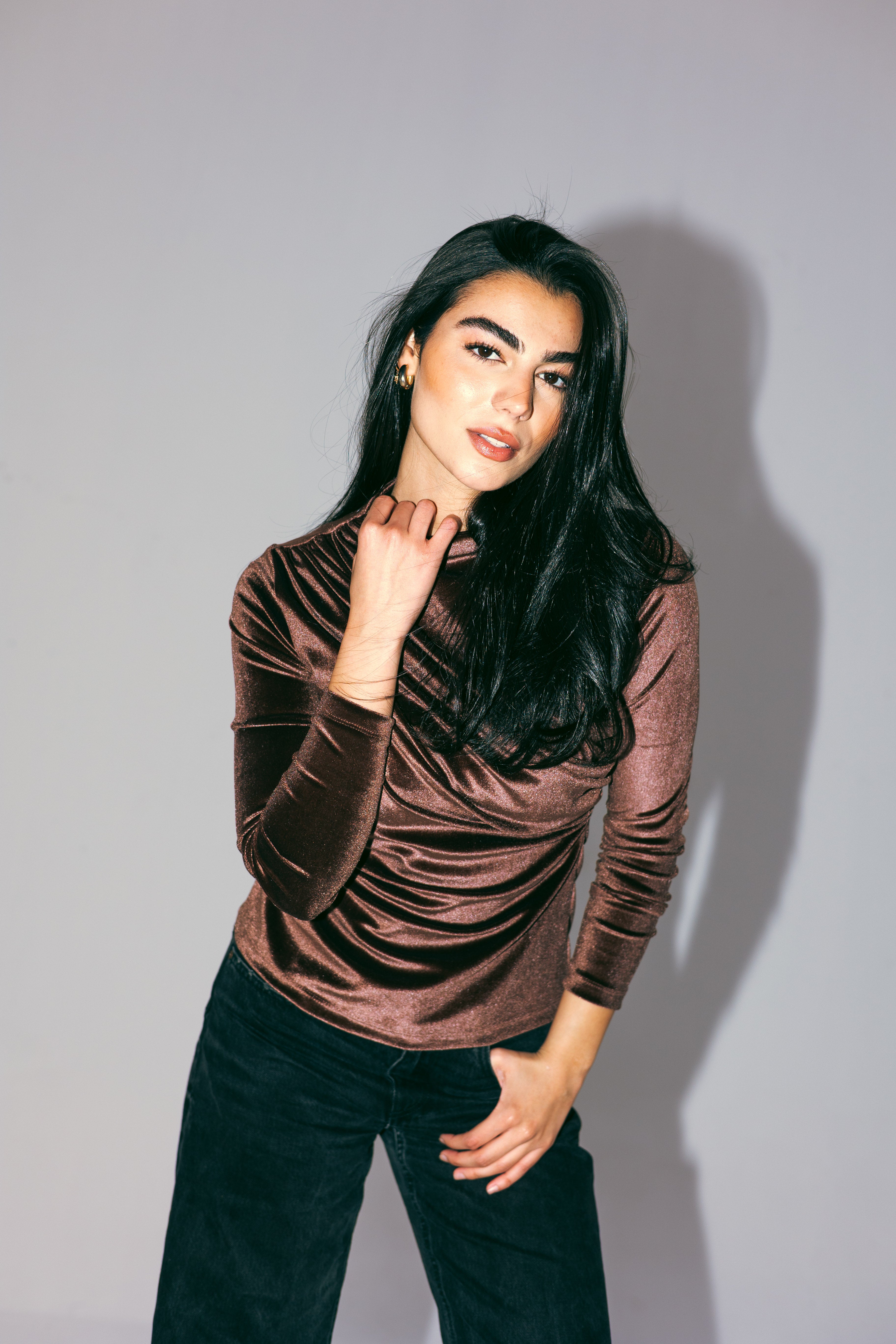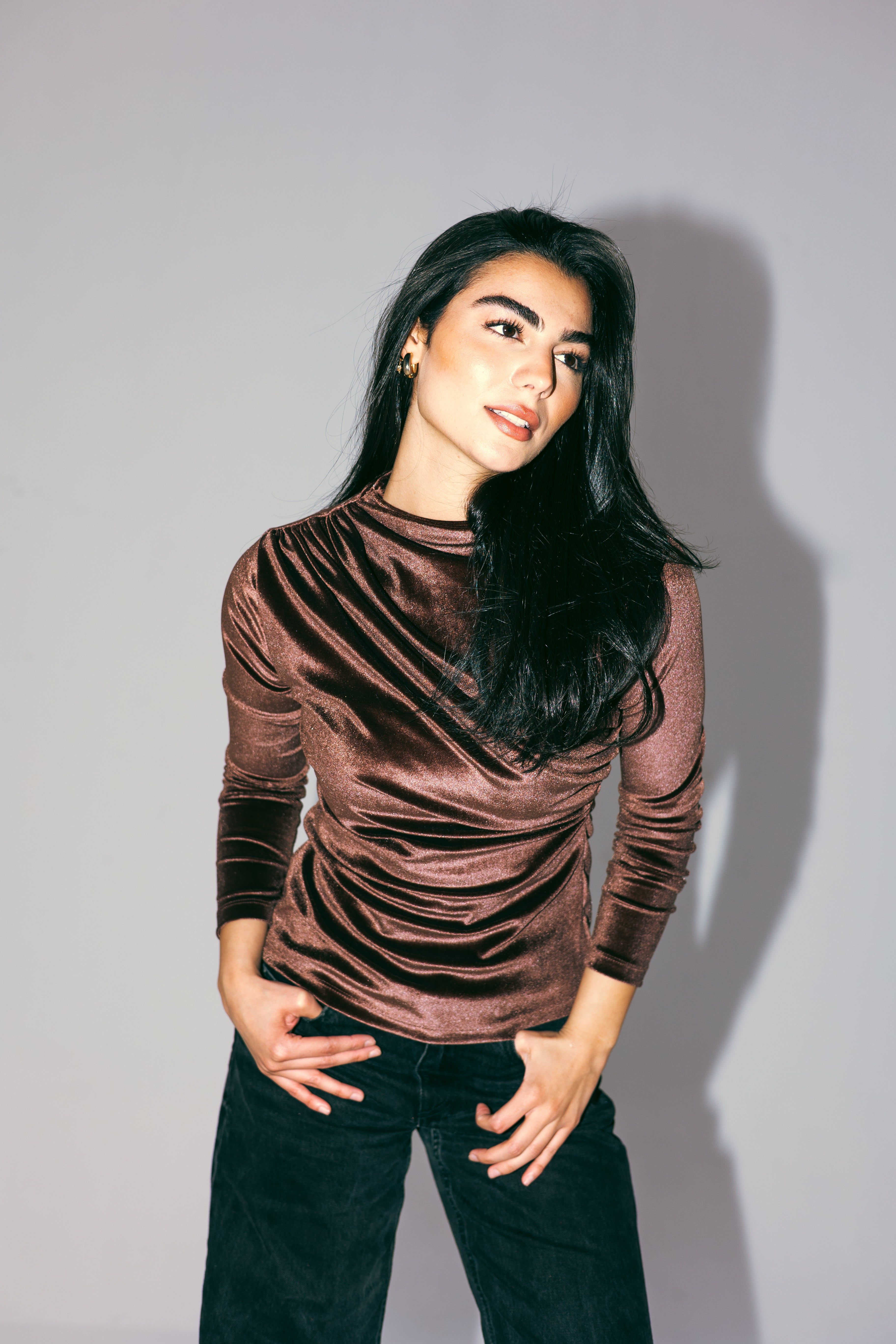 VELVET DRAPE TOP -BROWN