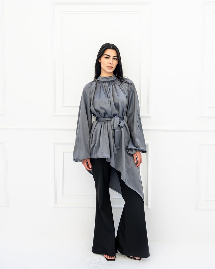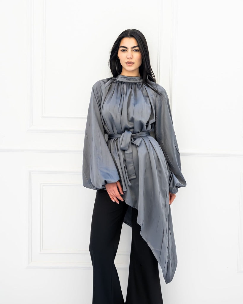 CRINKLE HIGH LOW BLOUSE-GRAY