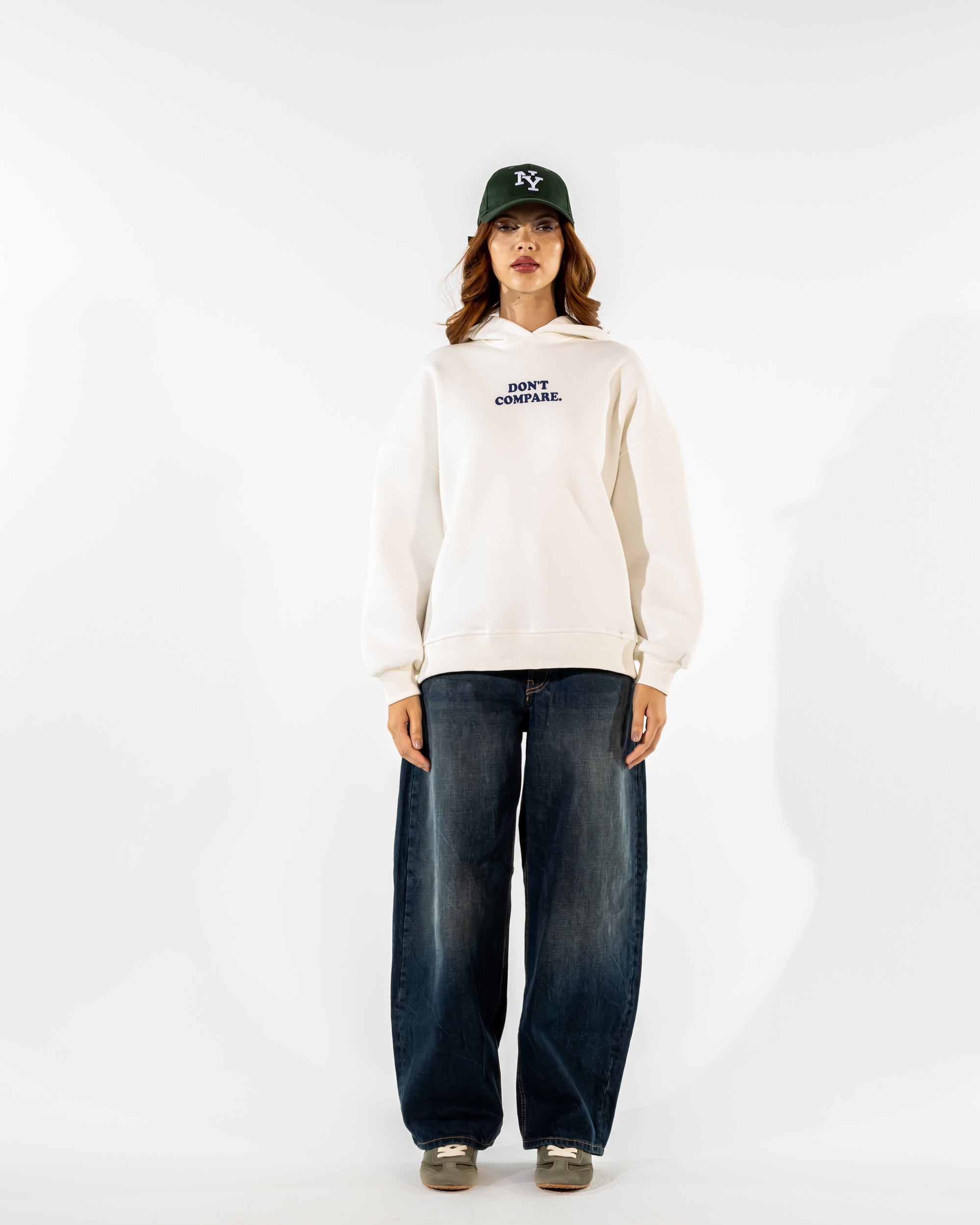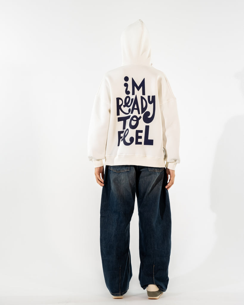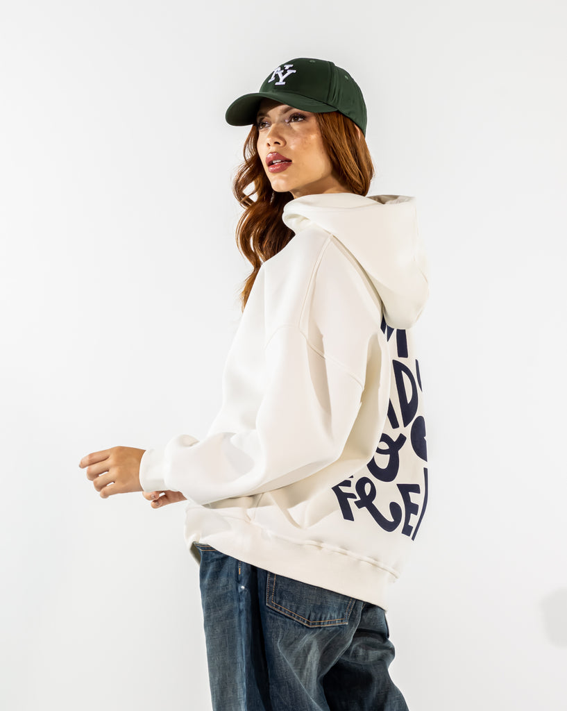 FLOCKED SLOGAN HOODIE-WHITE - is backordered and will ship as soon as it is back in stock.