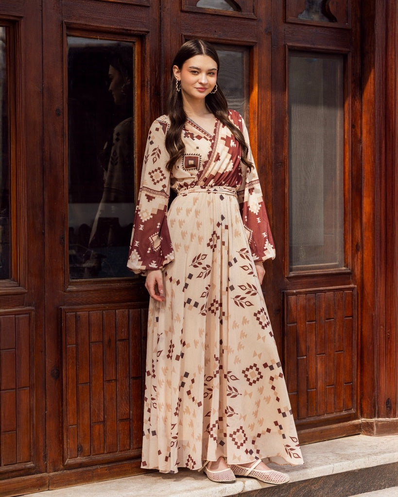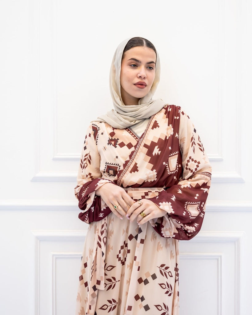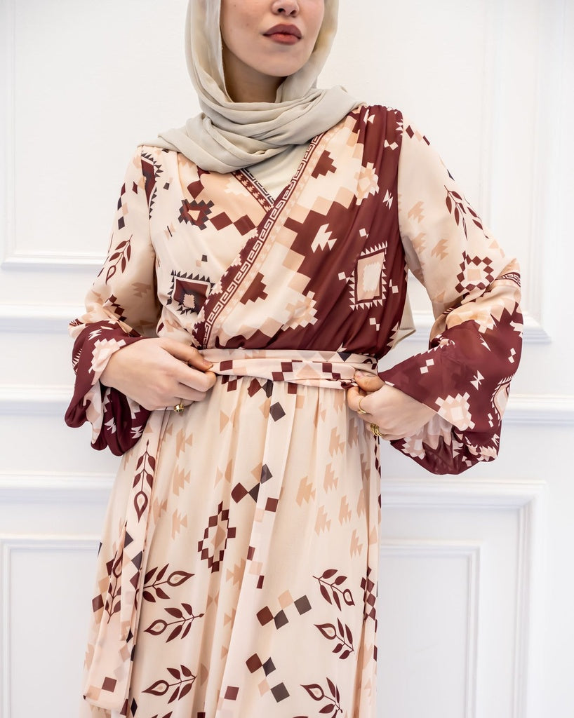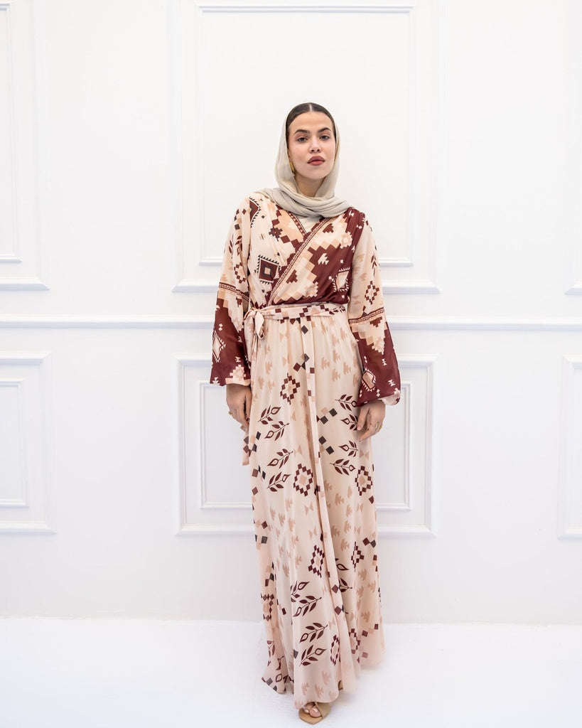 This BEIGE pattern chiffon dress boasts a unique, eye-catching design that is perfect for any occasion. Made of soft, flowy chiffon fabric, this dress is both comfortable and stylish. Its intricate pattern adds a touch of elegance, making it a must-have piece for your wardrobe.