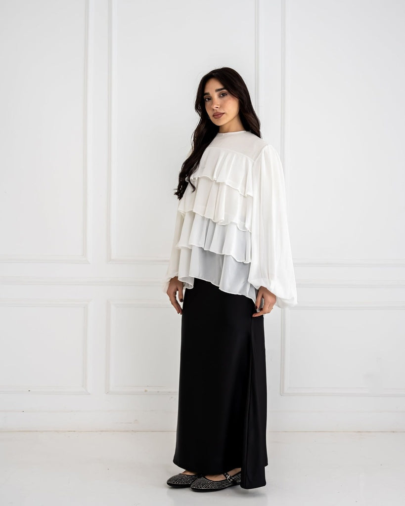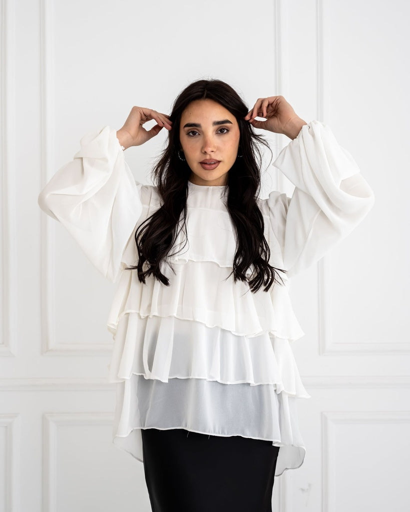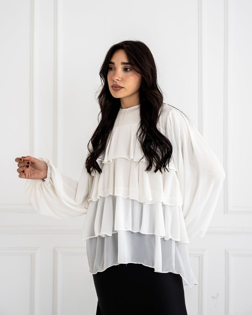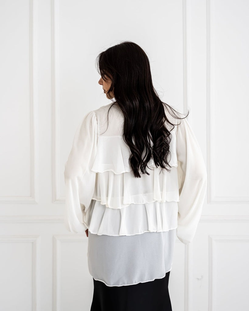 As an expert in the fashion industry, I am proud to present this Ruffle Chiffon Blouse in stunning white. Made with high-quality chiffon, this blouse features delicate ruffles that add a touch of elegance and femininity. Perfect for any occasion, this blouse exudes sophistication and style.