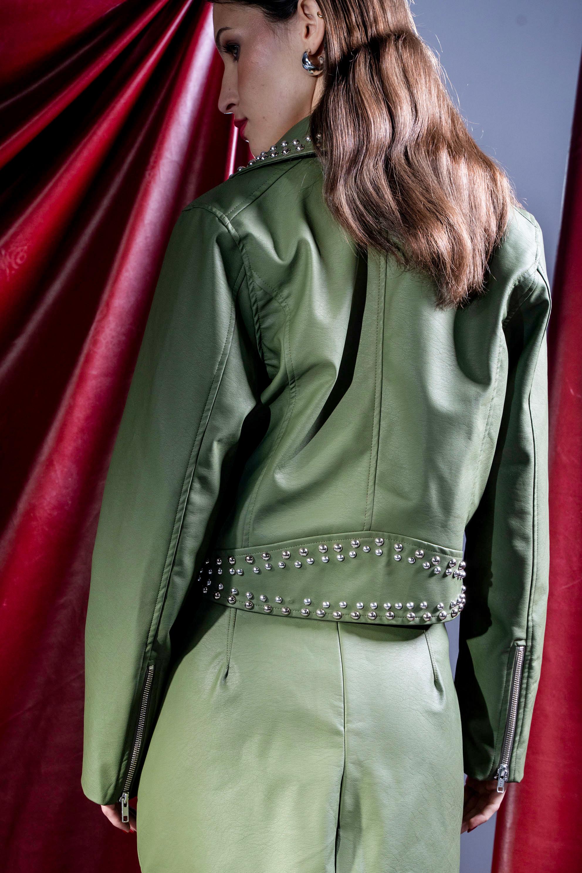 STUDDED CROPPED LEATHER JACKET -OLIVE - is backordered and will ship as soon as it is back in stock.