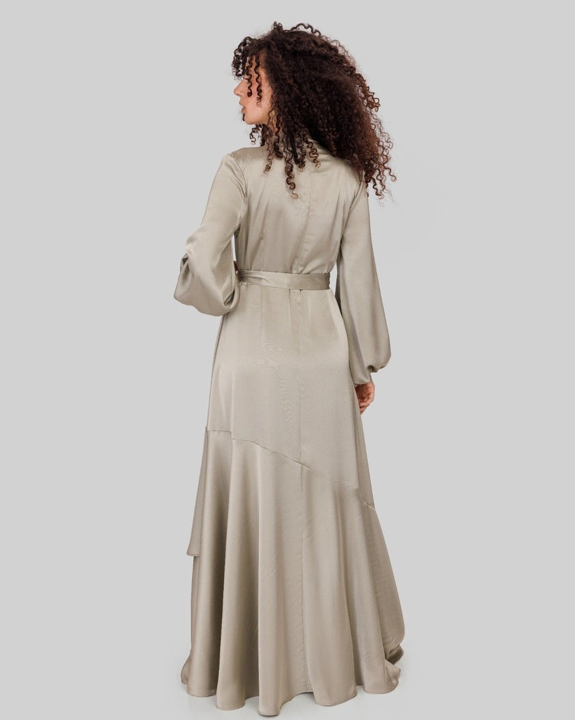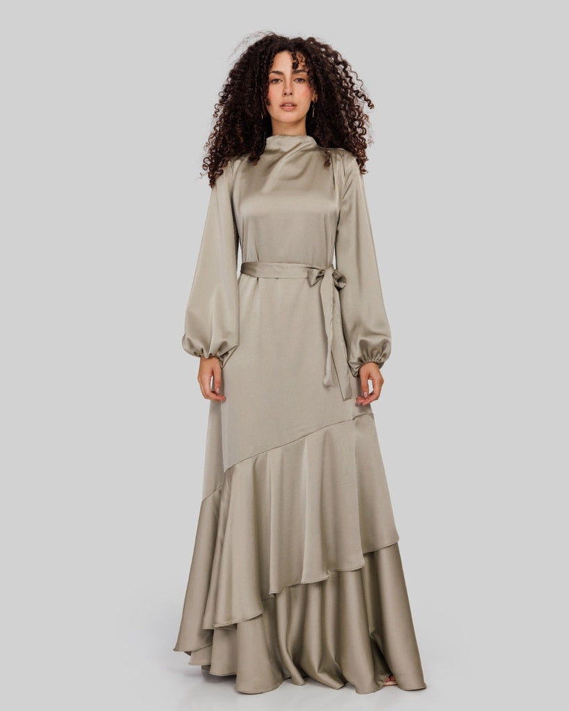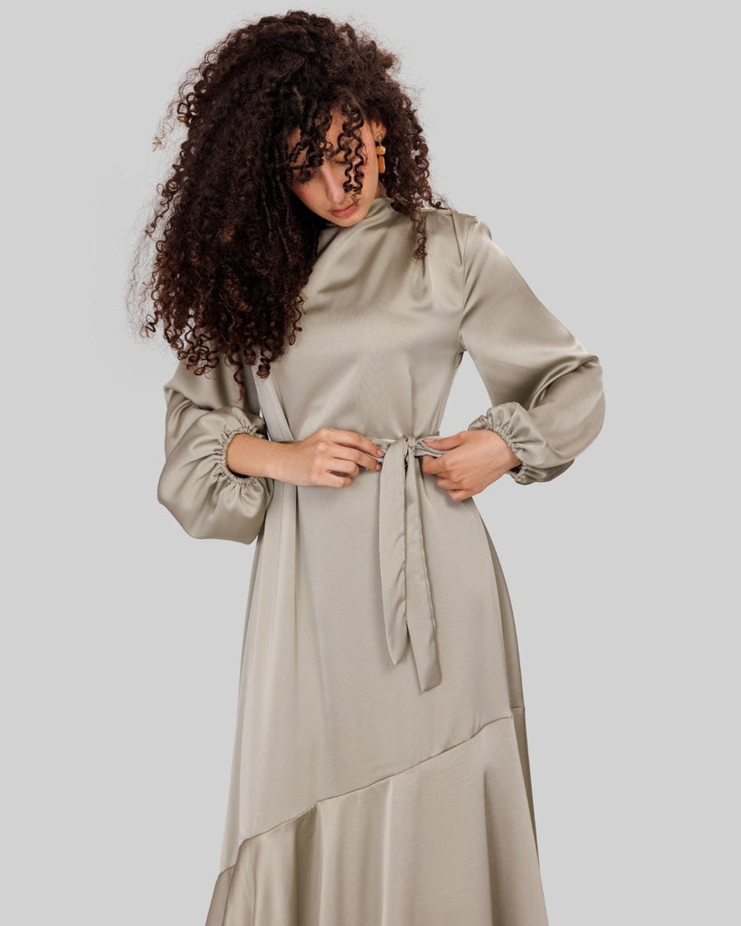 The Ruffle Satin Dress in Olive is a must-have for any fashion-forward individual. Made with luxurious satin fabric, this dress features delicate ruffles that add a touch of femininity. Its trendy olive color adds a unique twist to any outfit. Perfect for any special occasion, this dress will make you stand out in style.