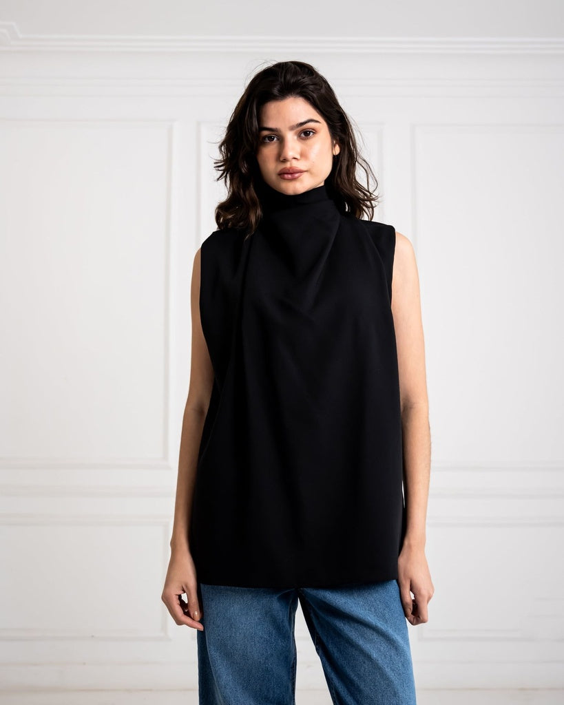 The sleeveless drapped top in black allows for a comfortable and fashionable look that is perfect for any occasion. With its lightweight material and elegant drapery, you can stay cool and stylish throughout the day. Elevate your wardrobe with this essential piece.