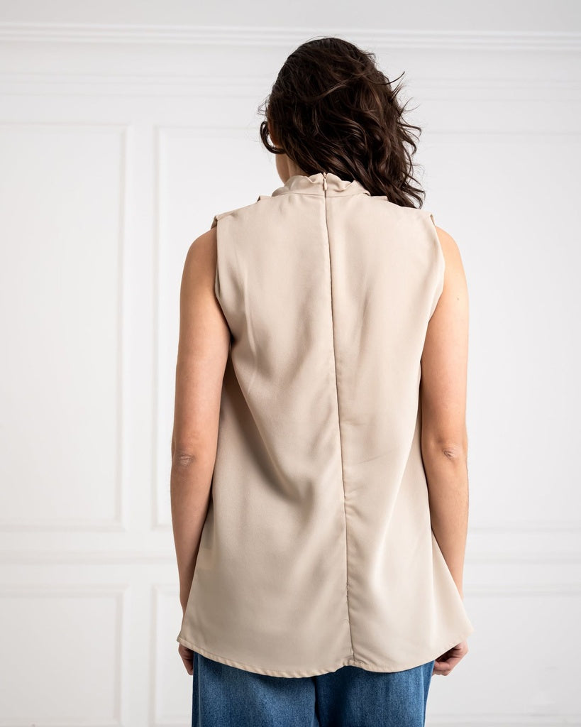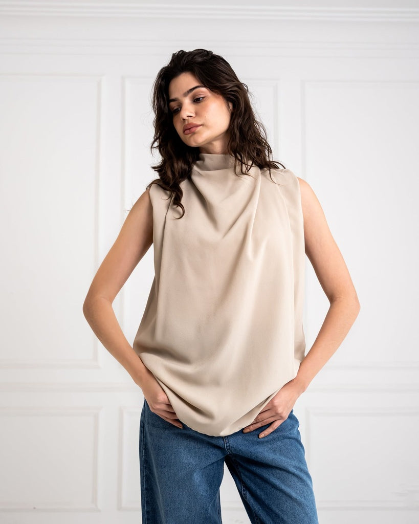 This BEIGE sleeveless draped top offers an effortless and stylish addition to your wardrobe. With its lightweight fabric and flowy fit, it's perfect for any occasion. Made with quality materials, this top provides comfort and versatility, making it a must-have for any fashion-forward individual.