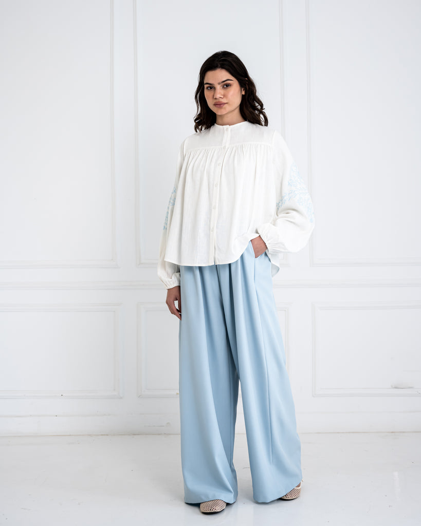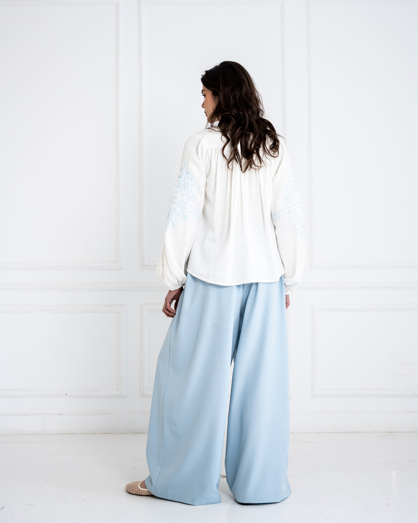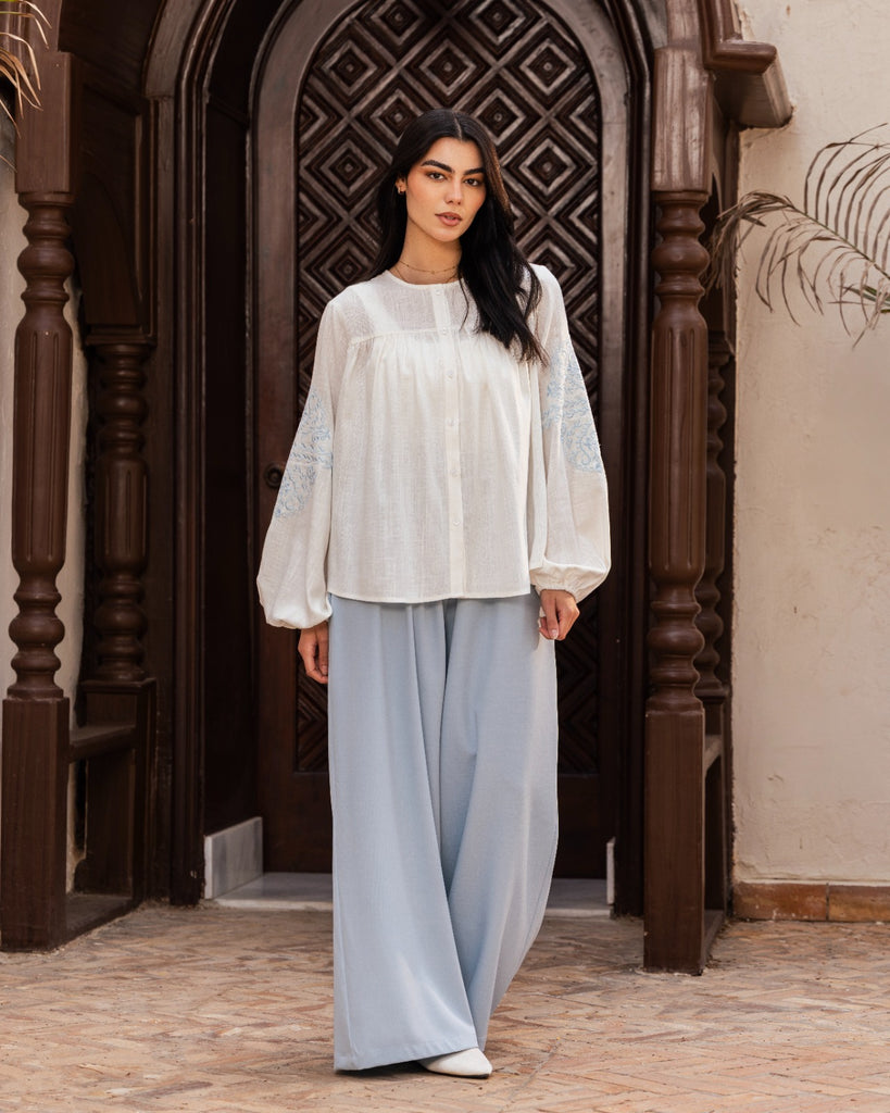 EMDROIDERED SLEEVES LINEN BLOUSE-OFF WHITE