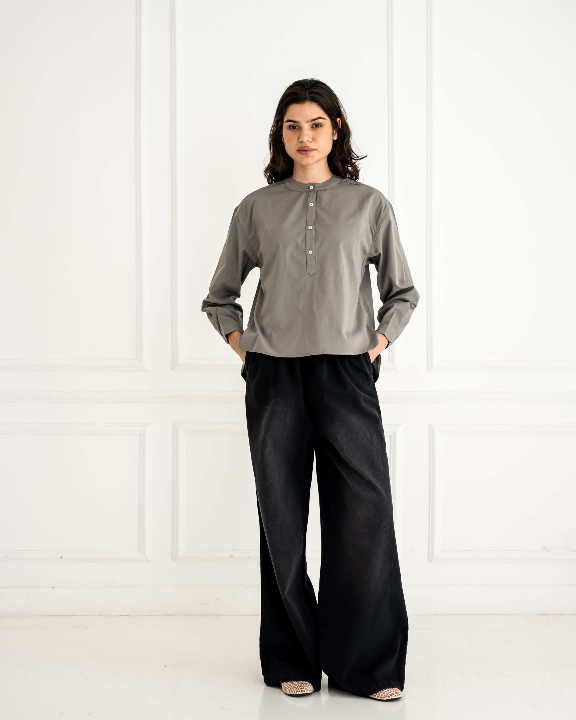 Expertly crafted from high-quality fabric, our PLAIN BLOUSE in OLIVE is a versatile and timeless addition to any wardrobe. With its simple design and classic color, it can be easily dressed up or down for any occasion. Enjoy comfortable and stylish sophistication with our PLAIN BLOUSE in OLIVE.
