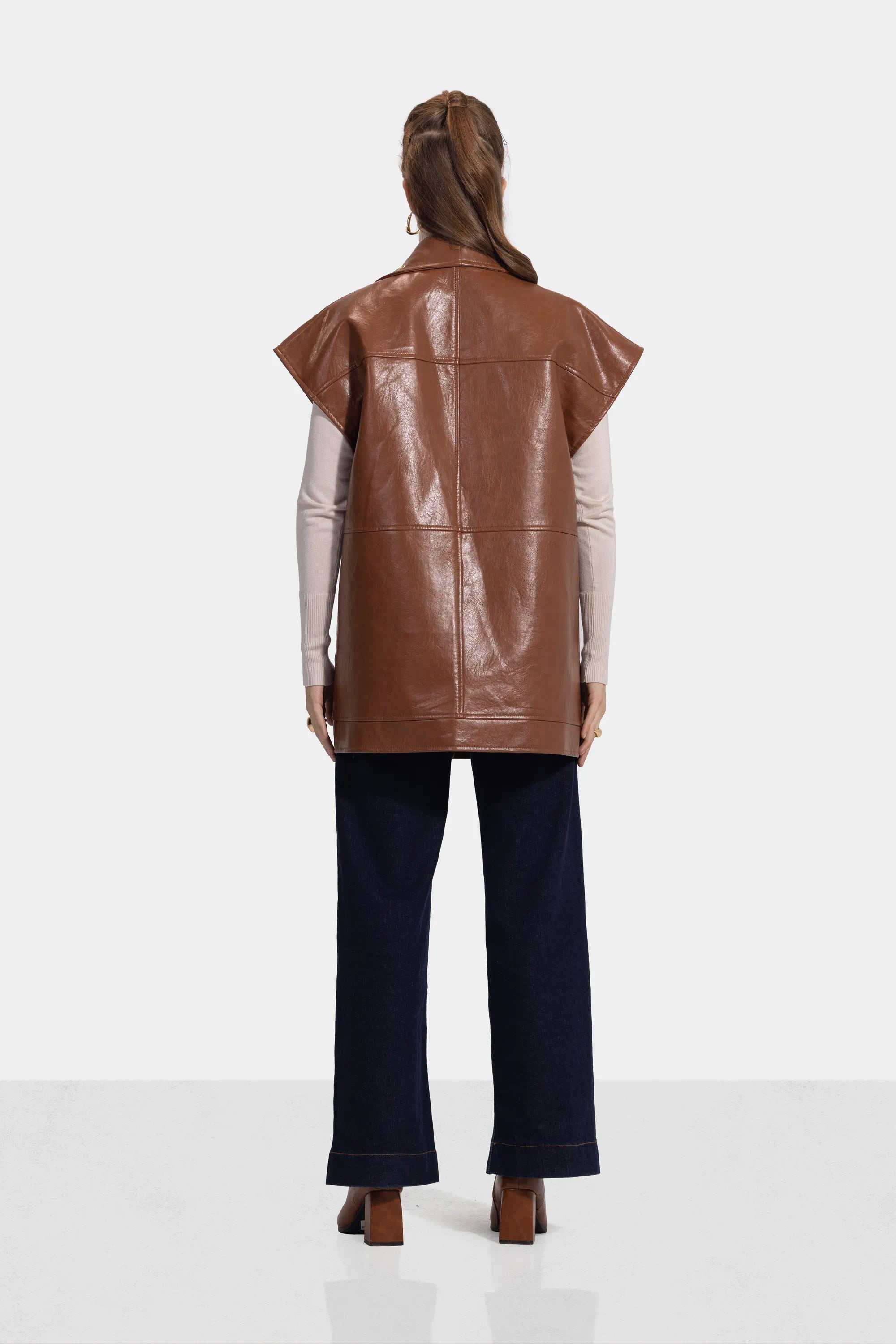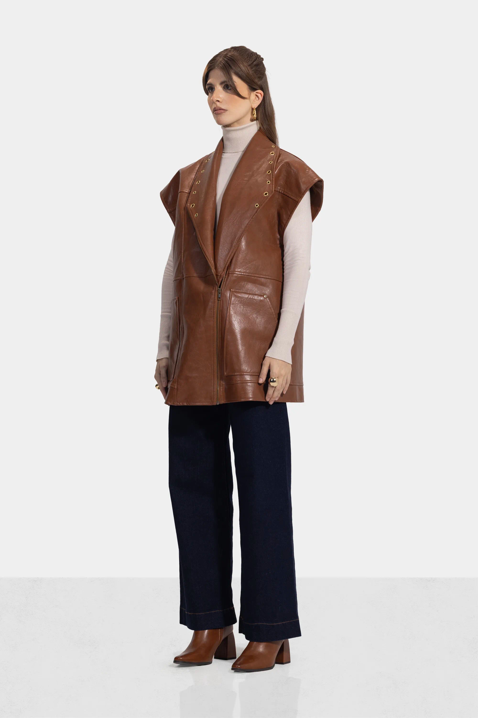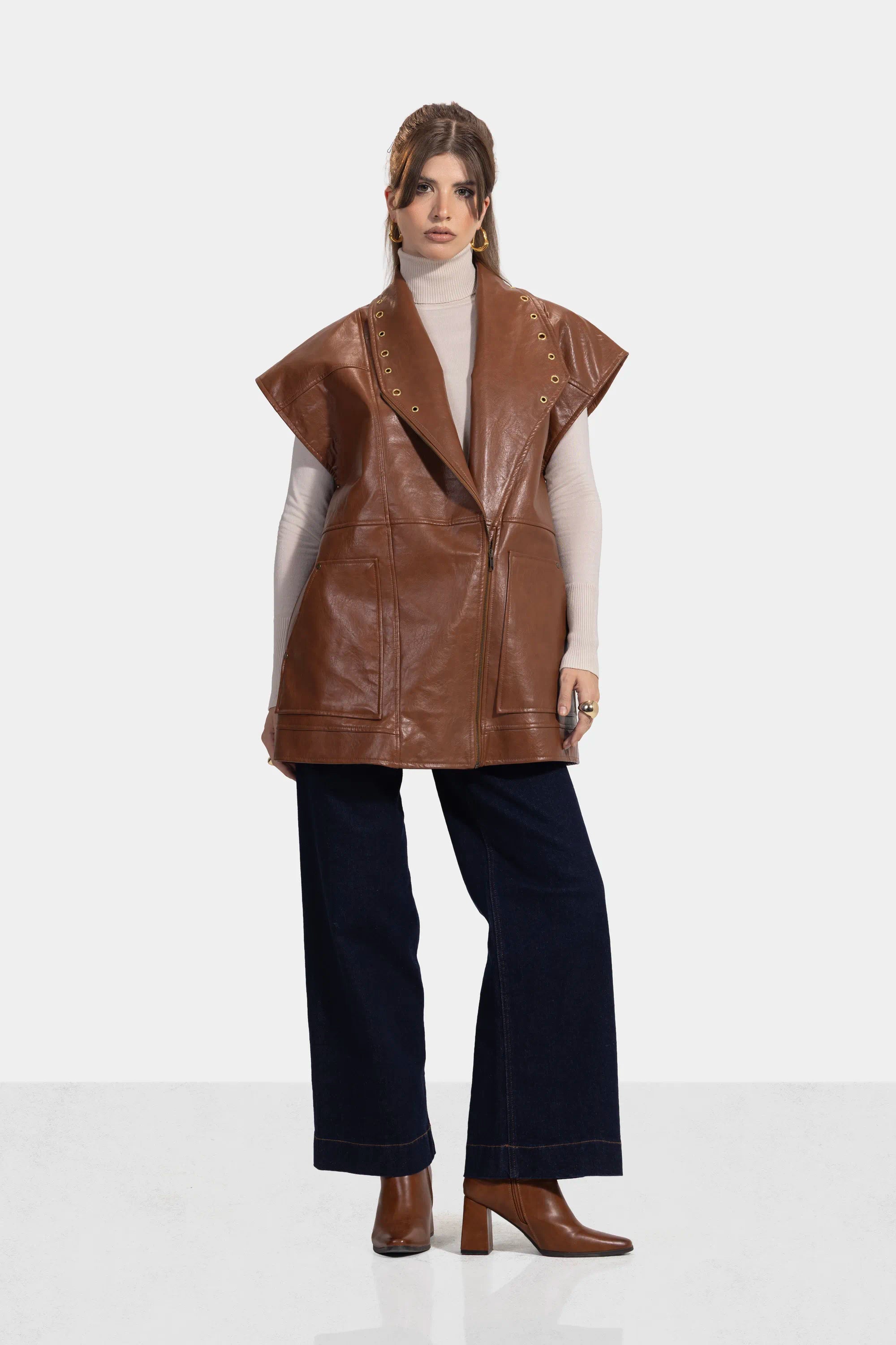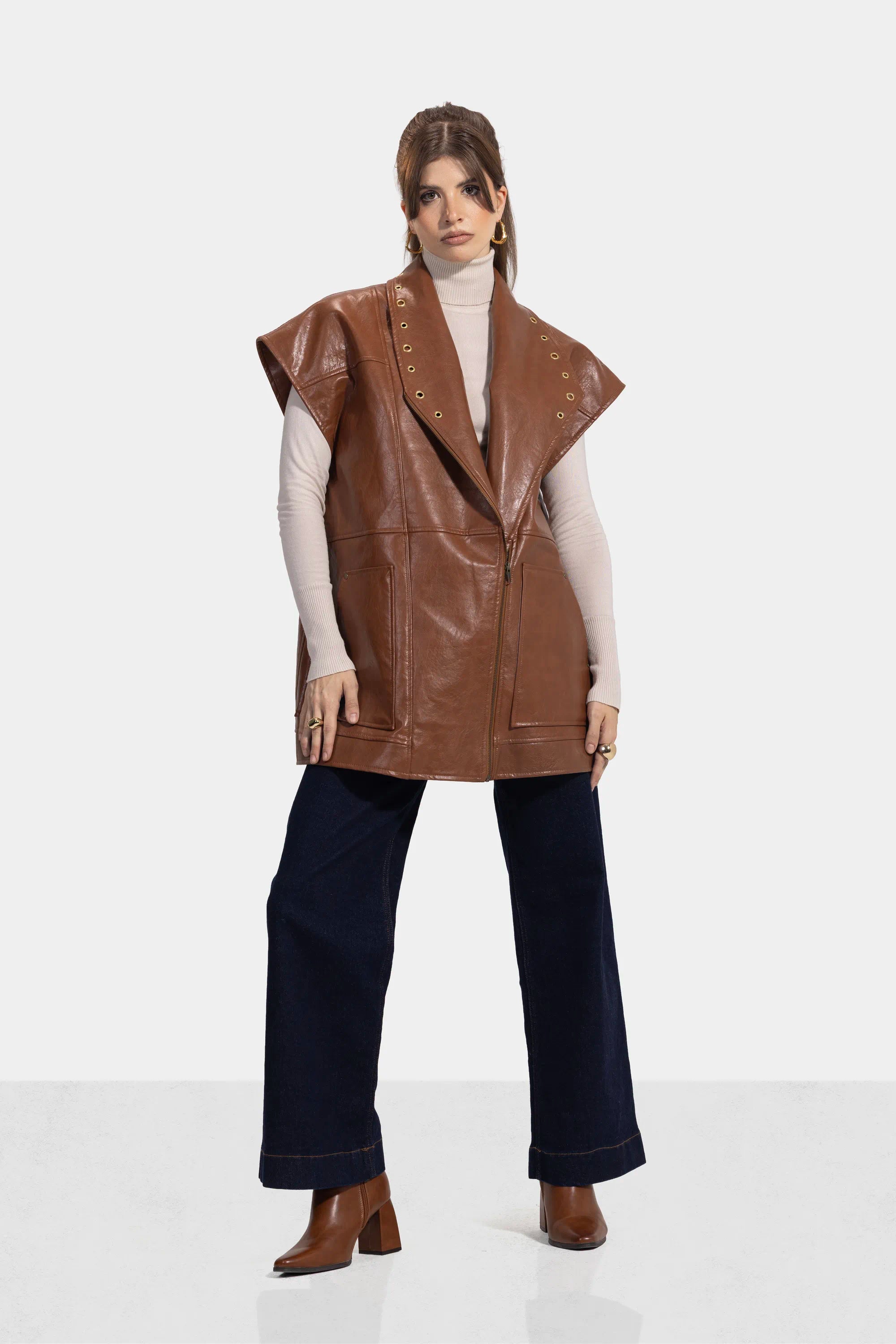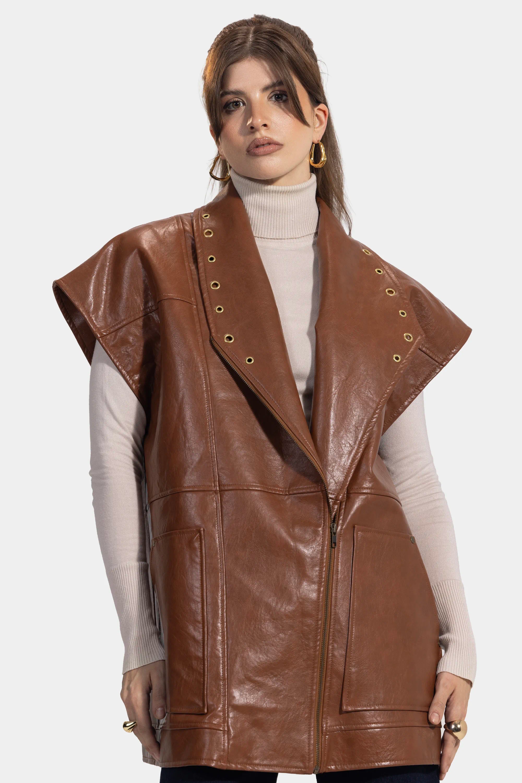 A long faux-leather vest with metallic eyelet detailing and a structured modern silhouette. Perfect for layered fall and winter styling.