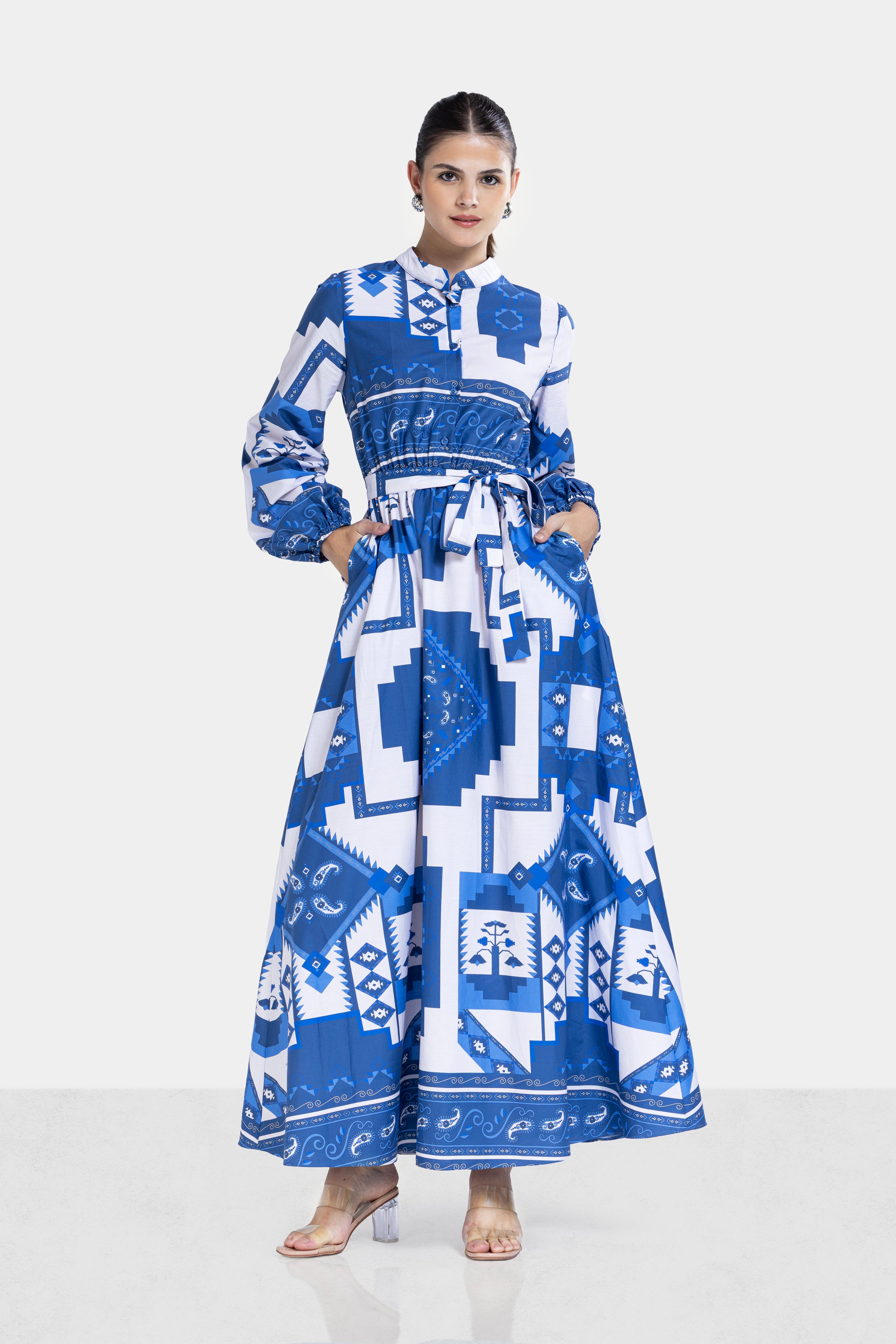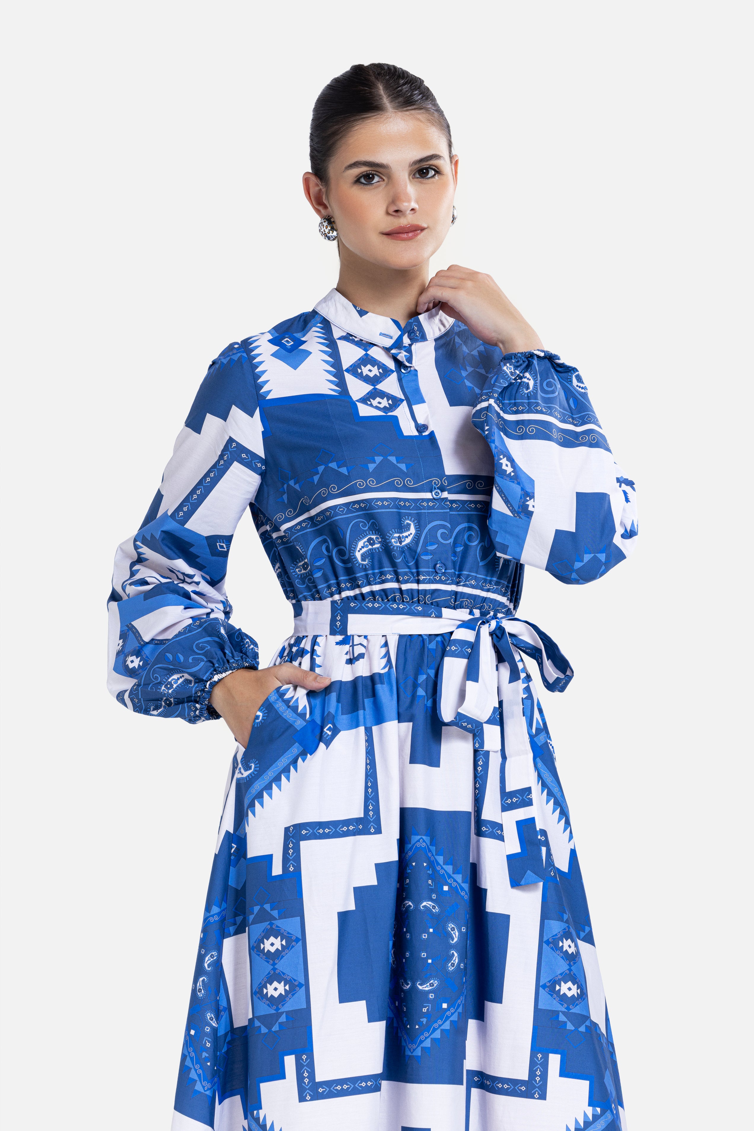 Elegant maxi dress crafted from premium cotton poplin fabric, known for its lightweight feel and breathable comfort. Designed with a striking blue geometric print, long sleeves, a flattering waist tie, and practical side pockets. The flowing silhouette makes it perfect for an effortless yet polished look.