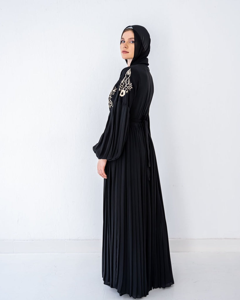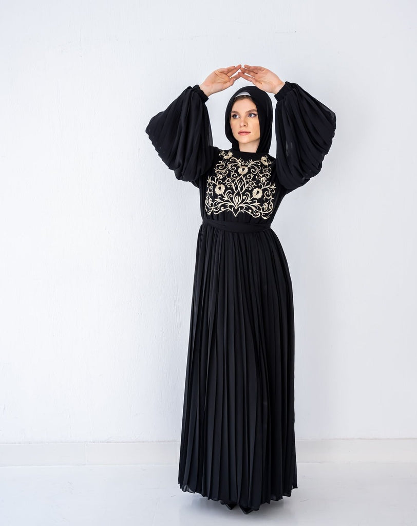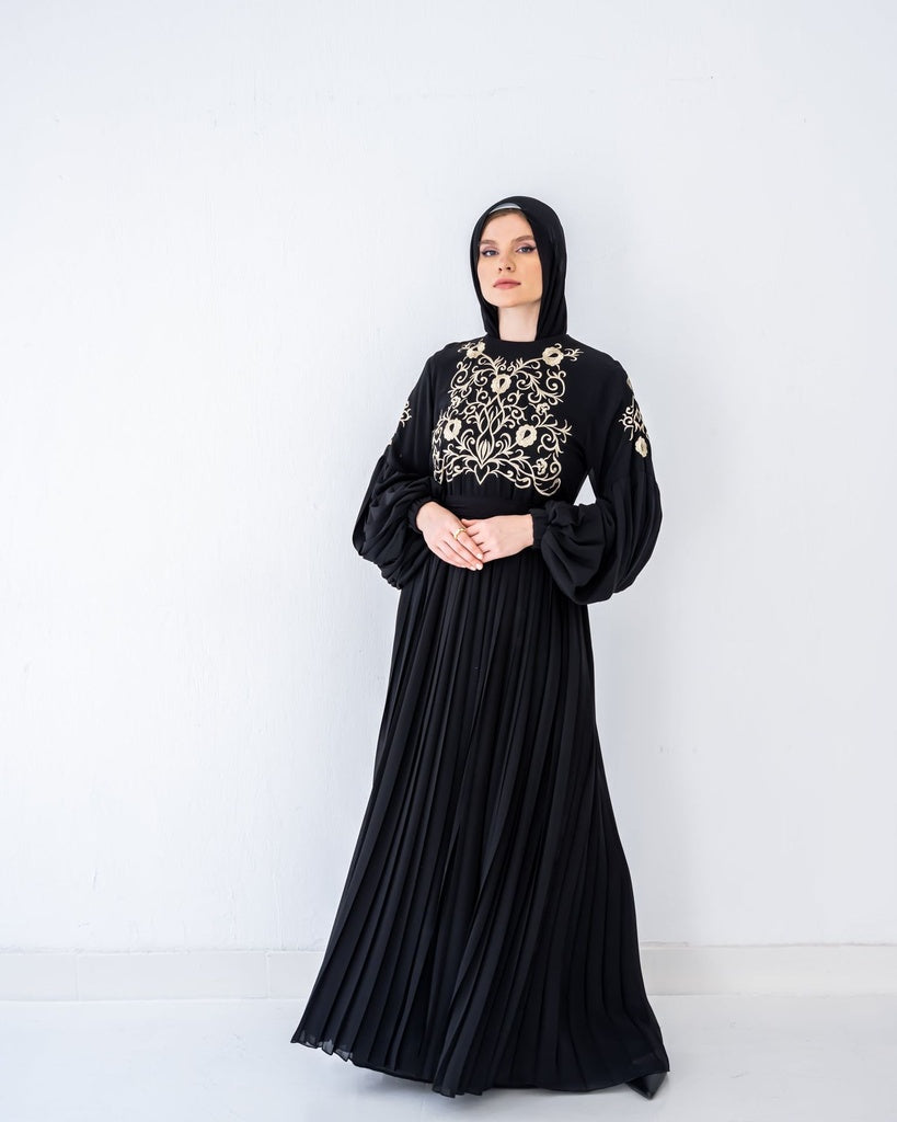 EMBROIDERED RUFFLE CHIFFON DRESS-BLACK