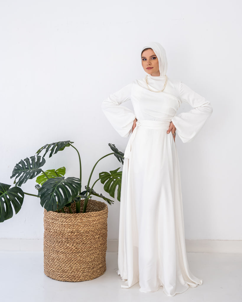 FLOWY SATIN DRESS-WHITE