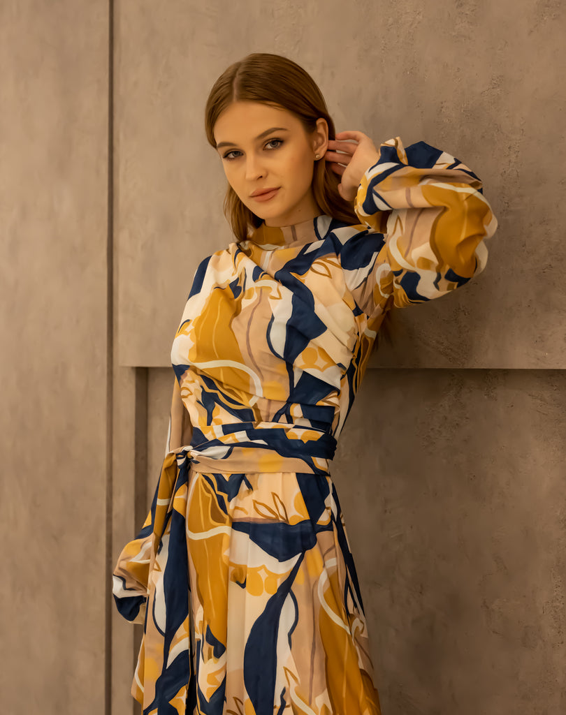 PRINTED DRAPPED DRESS-MUSTARD