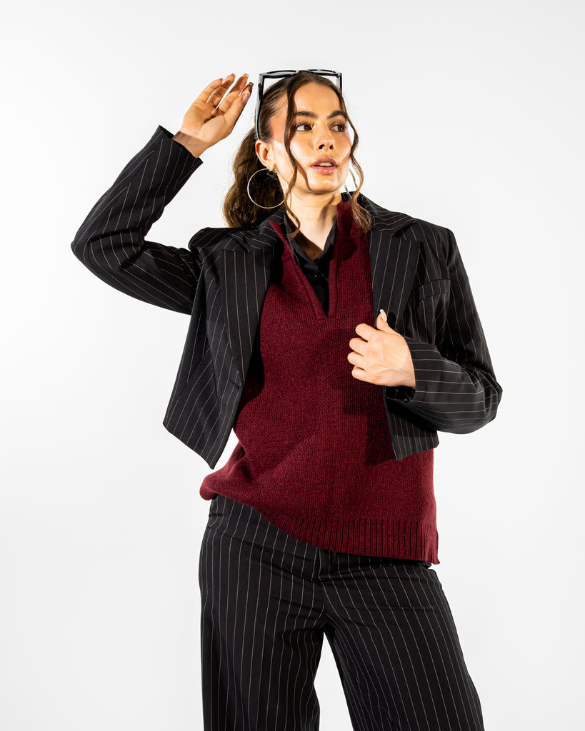 STRIPPED WIDE LEG PANTS-BLACK