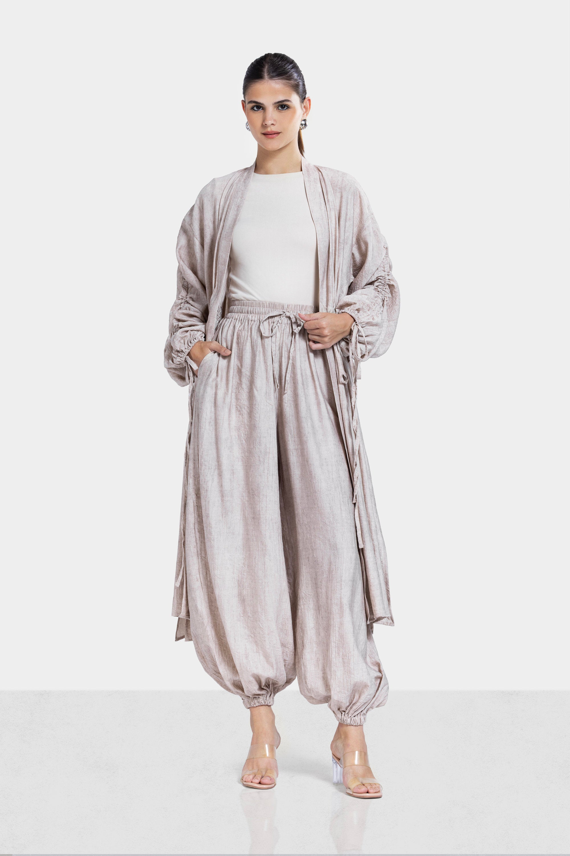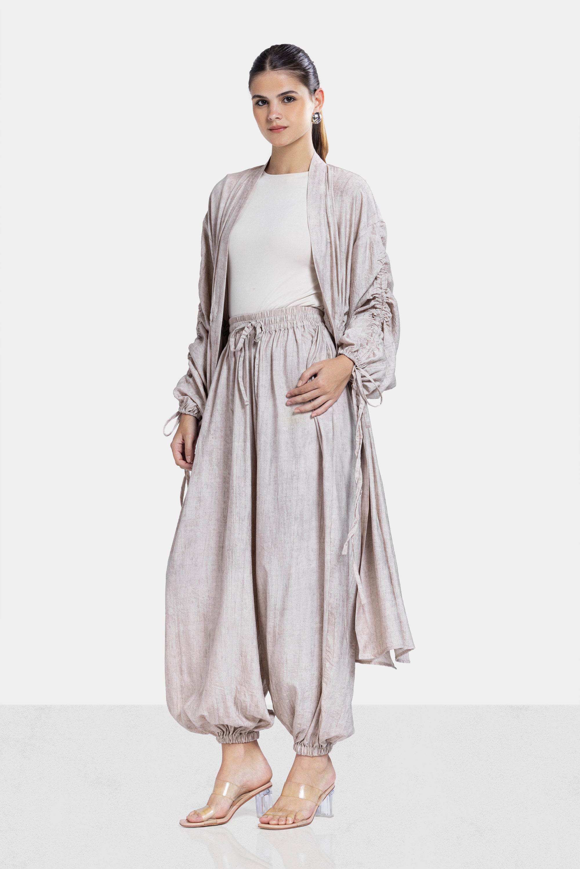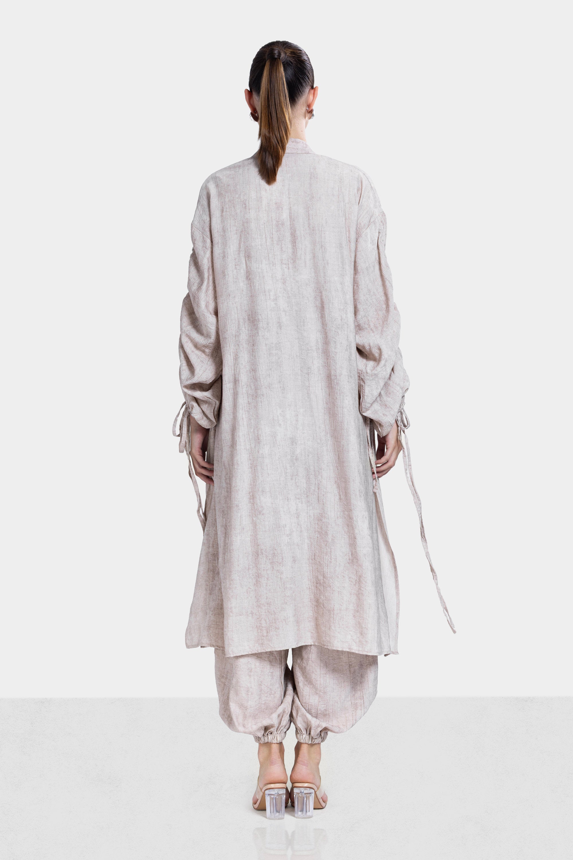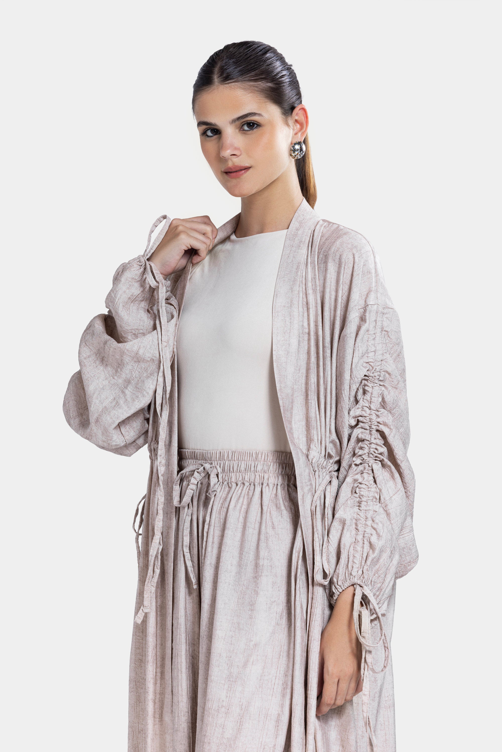 A lightweight layering piece designed with a soft crinkled texture and an elegant long silhouette. The relaxed structure makes it perfect for effortless everyday styling.