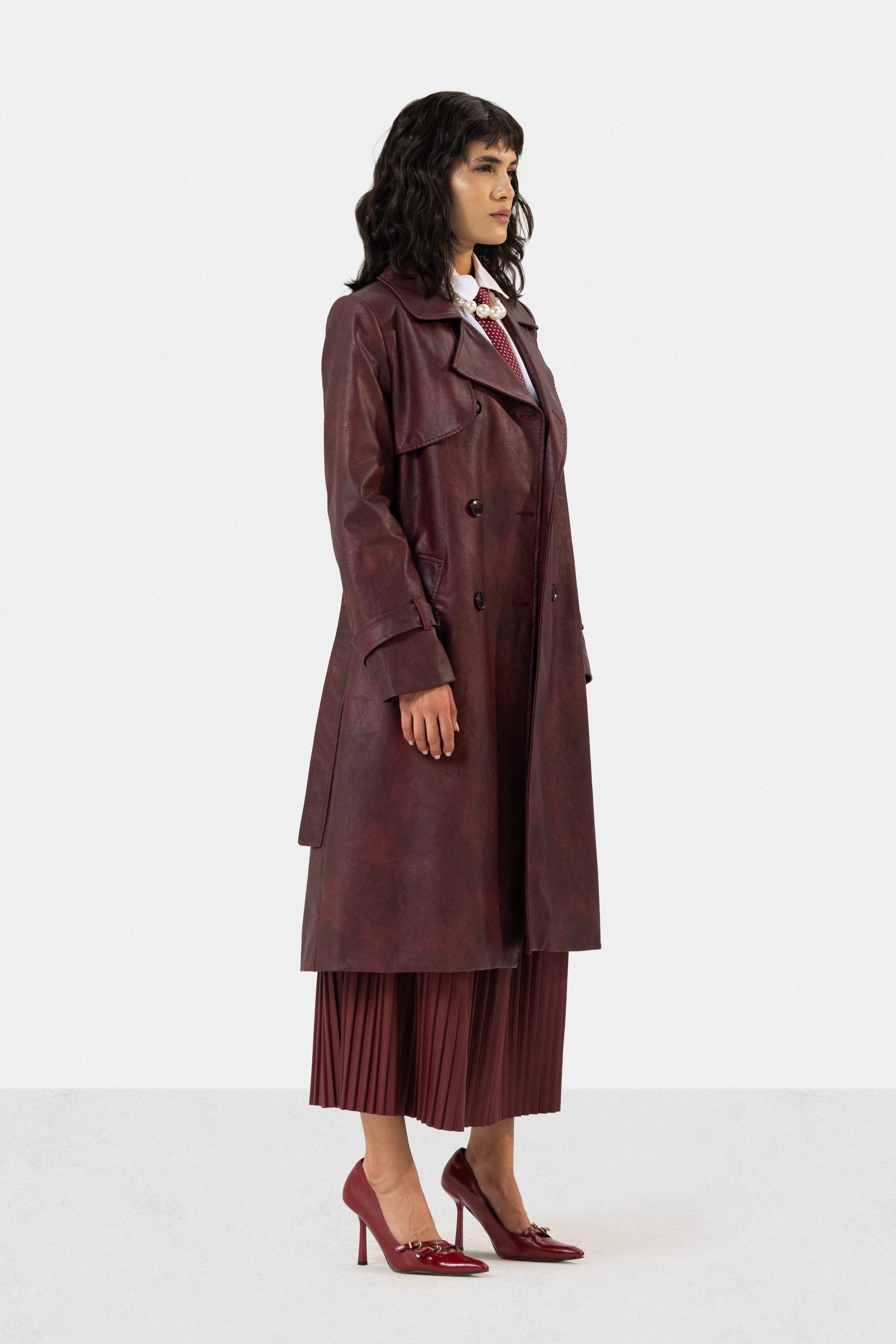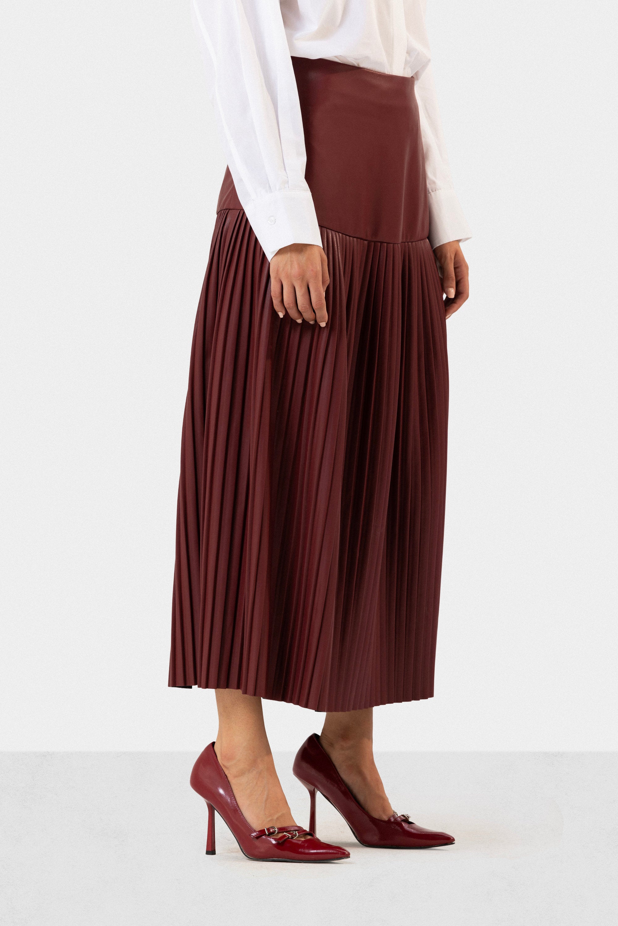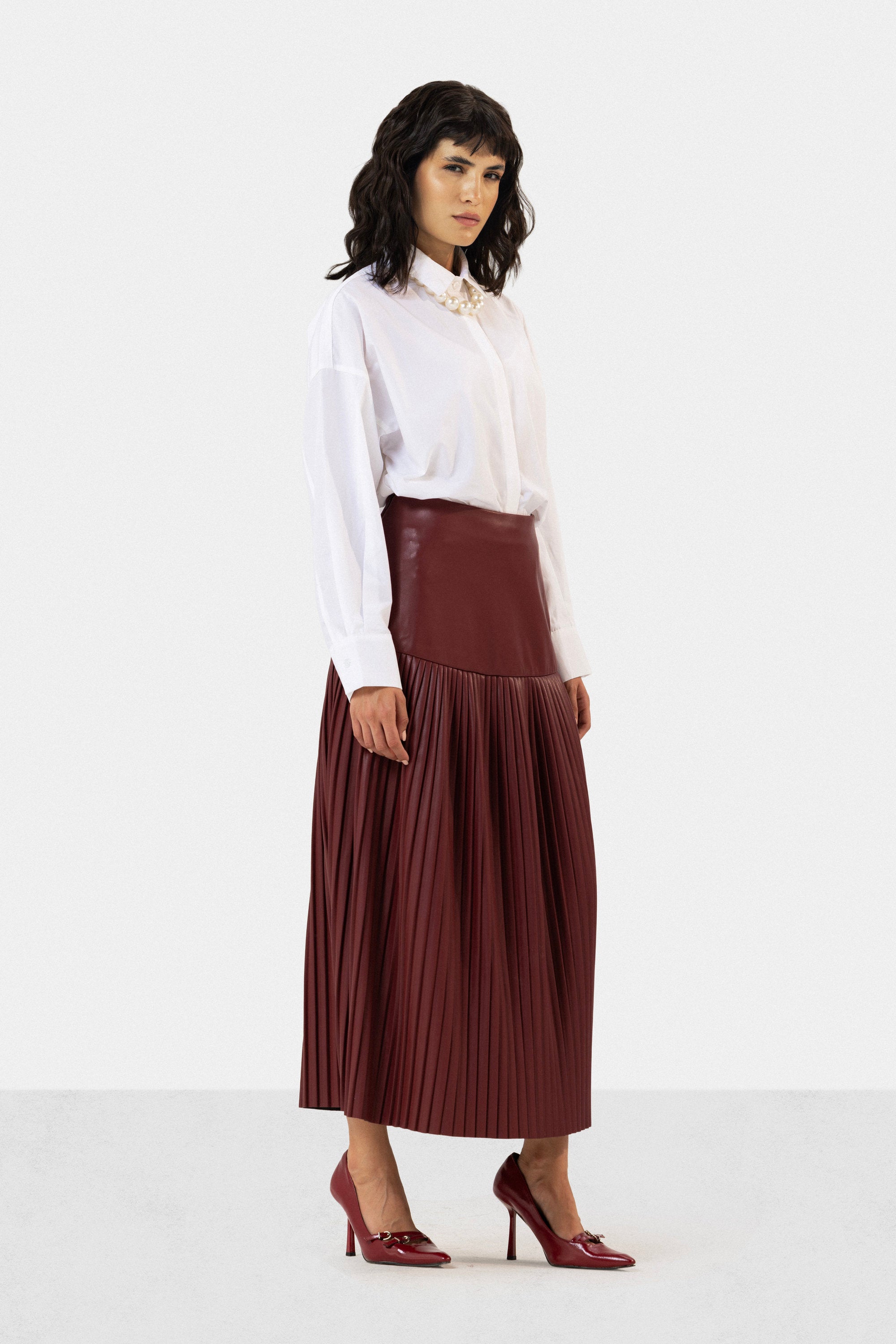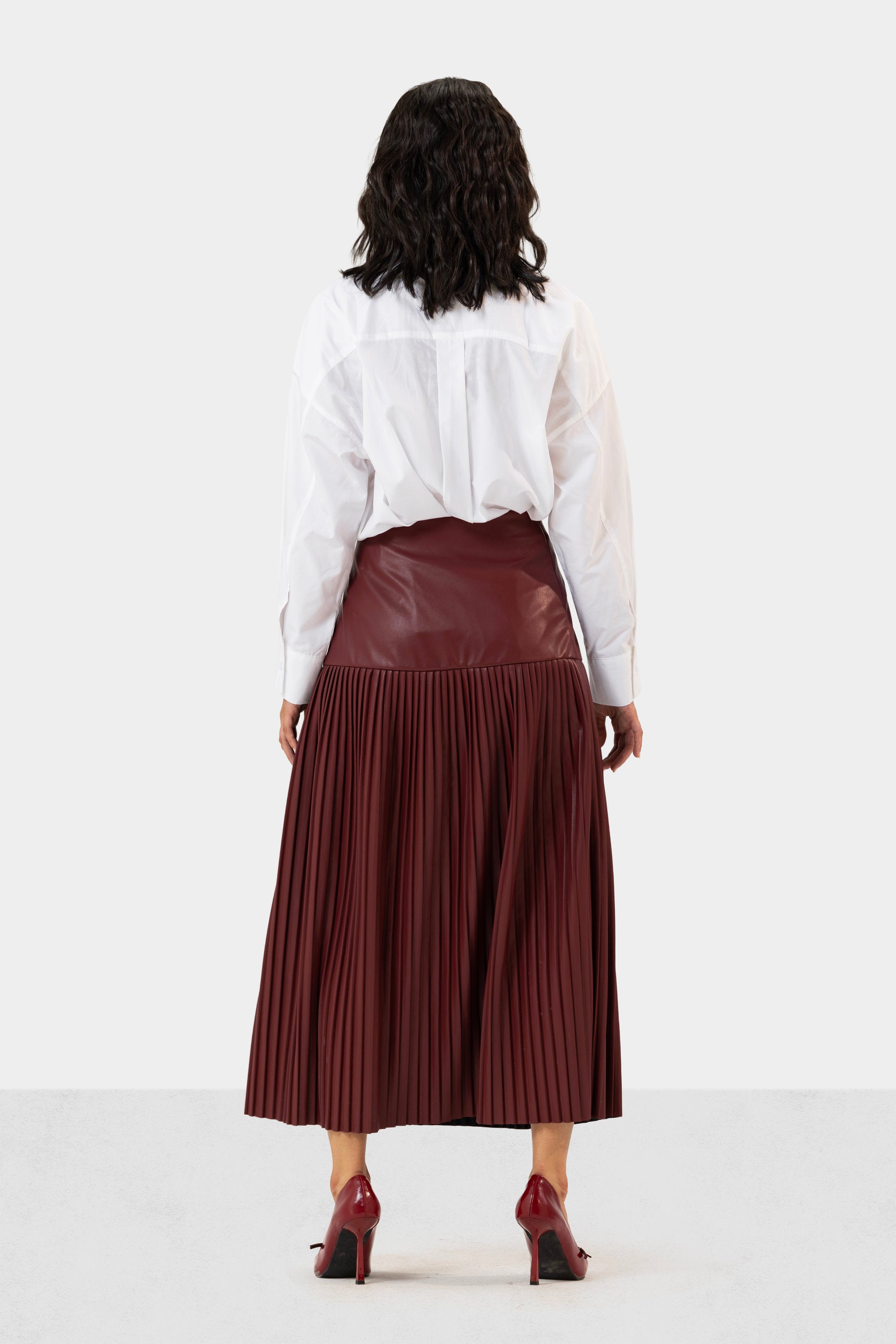 Discover our latest addition: a meticulously crafted pleated leather skirt in burgundy. Constructed from premium pleated leather, this piece showcases exceptional attention to detail with its precisely folded panels that create dimension and movement. The sumptuous burgundy tone delivers sophistication and versatility, pairing effortlessly with both neutral and bold pieces. The structured pleats maintain their shape while the quality leather develops a beautiful patina over time, ensuring longevity. An investment piece that transcends seasonal trends, ideal for discerning individuals seeking refined elegance and superior craftsmanship.