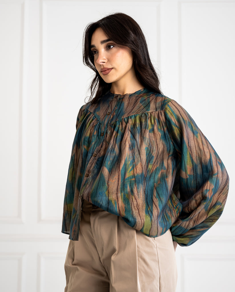Expertly crafted from high-quality materials, this olive printed cropped blouse exudes effortless style and sophistication. The unique print adds a touch of personality, while the cropped design offers a modern and trendy look. Perfect for any occasion, this blouse is a must-have addition to your wardrobe.
