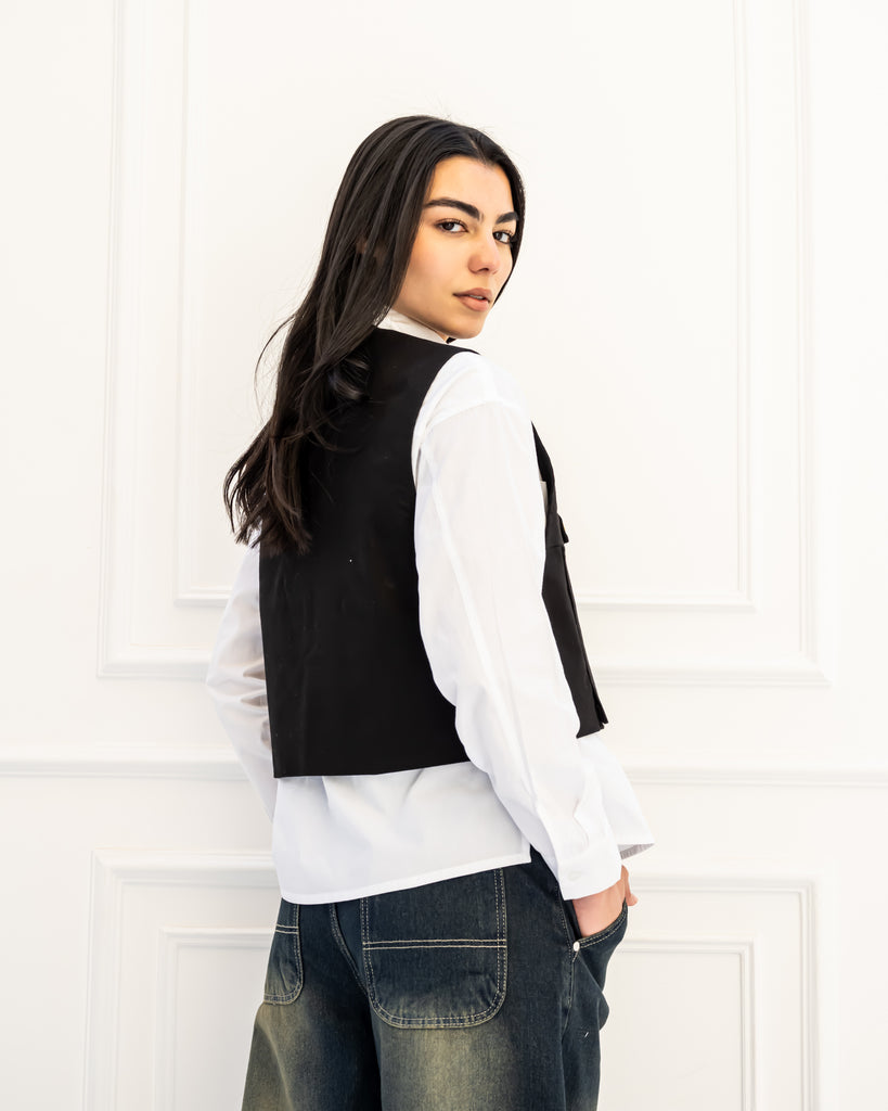 Expertly crafted from high-quality material, this Sleeveless Cropped Vest in classic black is a must-have addition to any wardrobe. Perfect for layering or as a statement piece, its versatile design offers endless styling possibilities. Stay on-trend and elevate any look with this timeless, stylish vest.