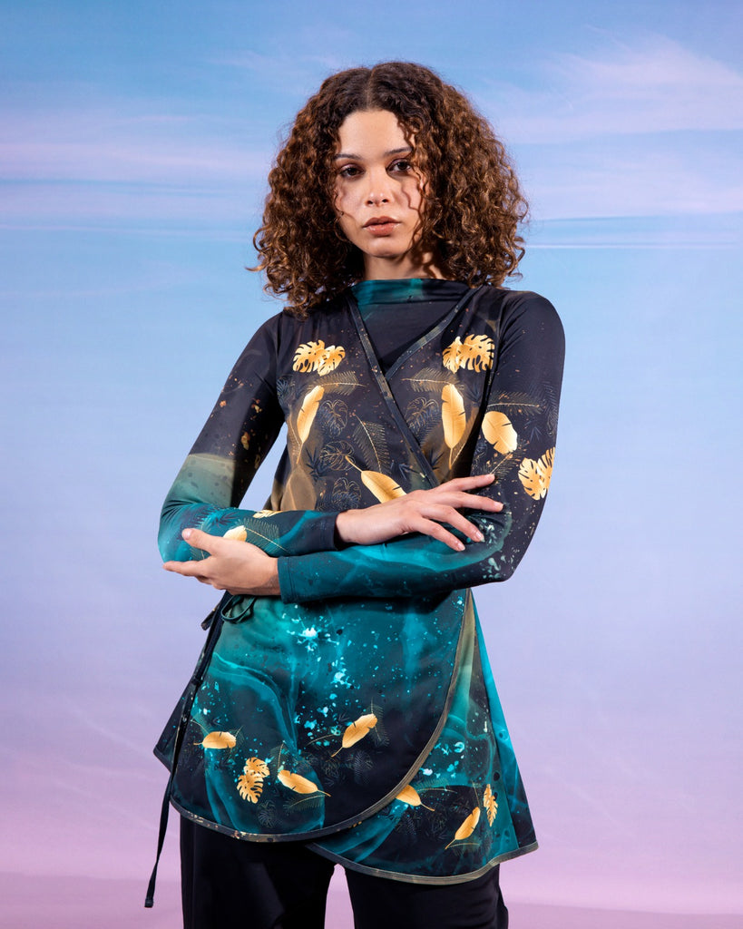 GOLD FEATHER SWIMSUIT TOP-BLUE BLACK ( TOP ONLY ) - is backordered and will ship as soon as it is back in stock.