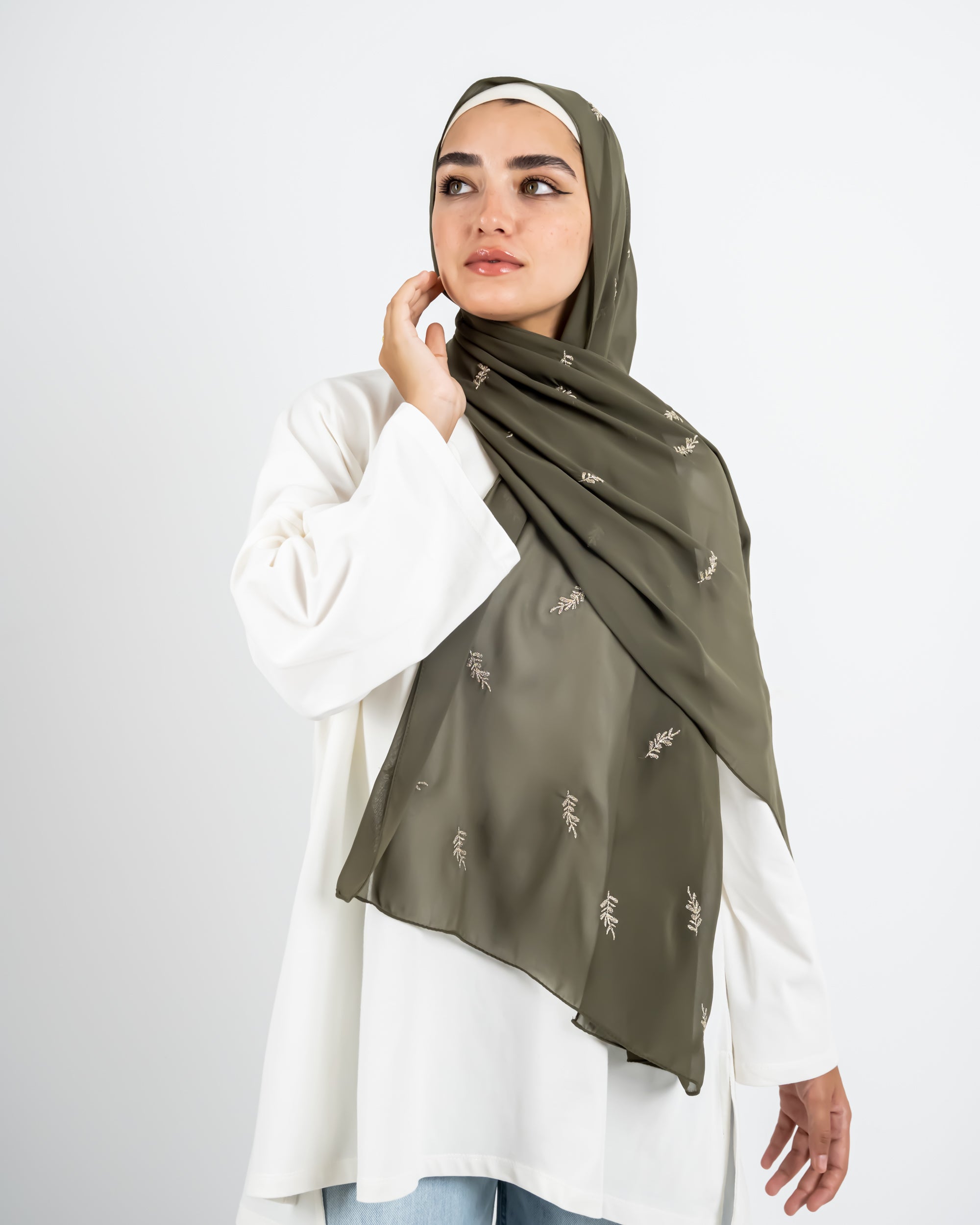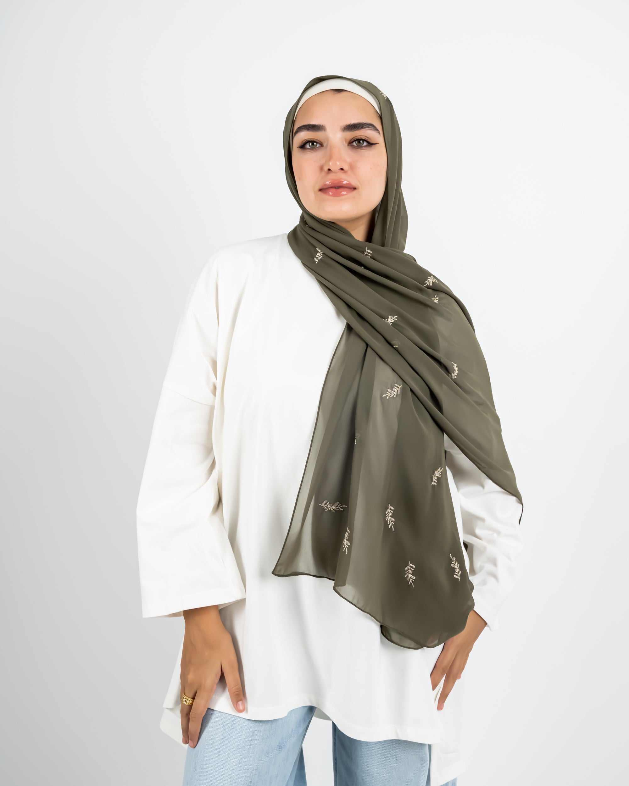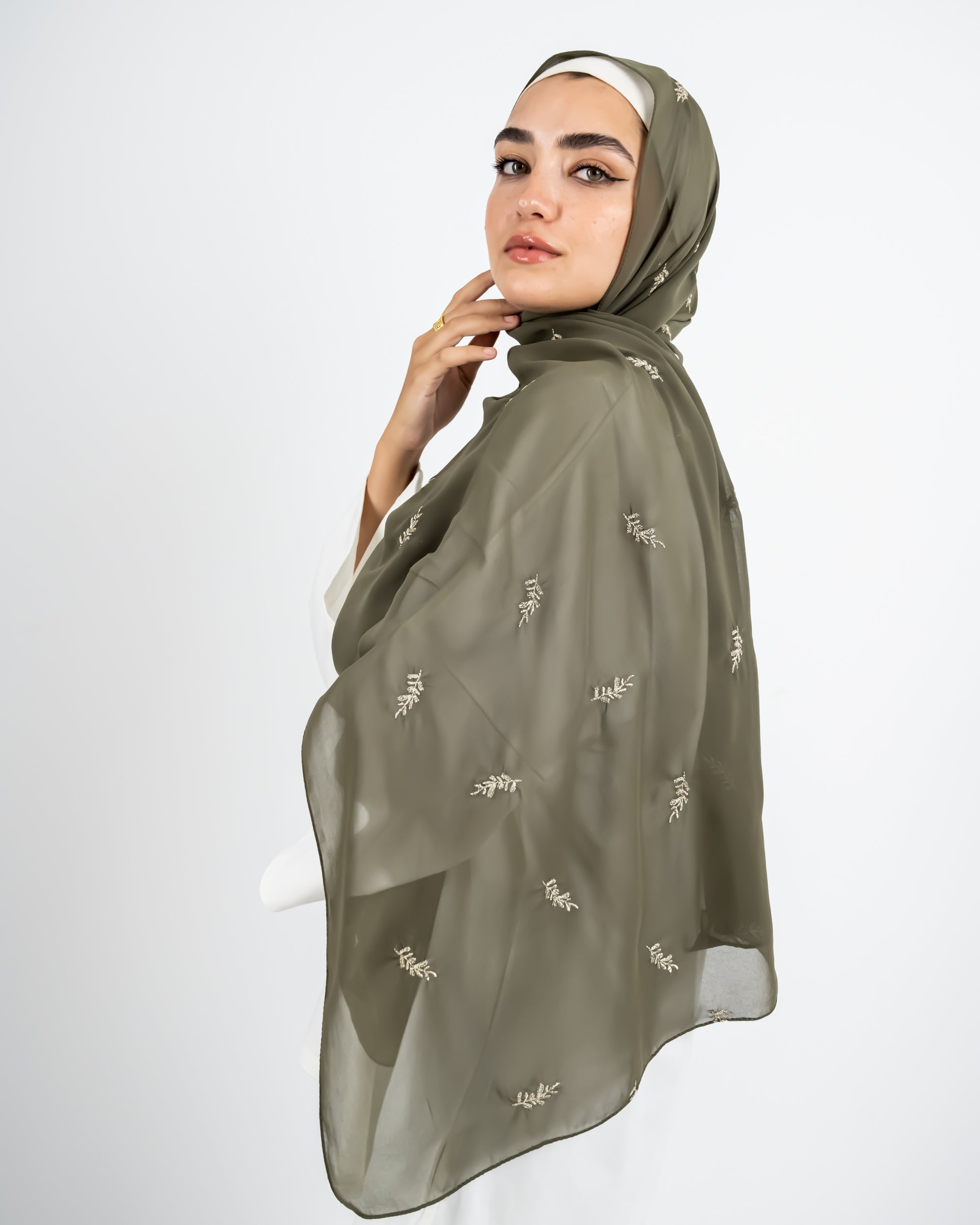 EMBROIDERED CHIFFON SCARF -OLIVE