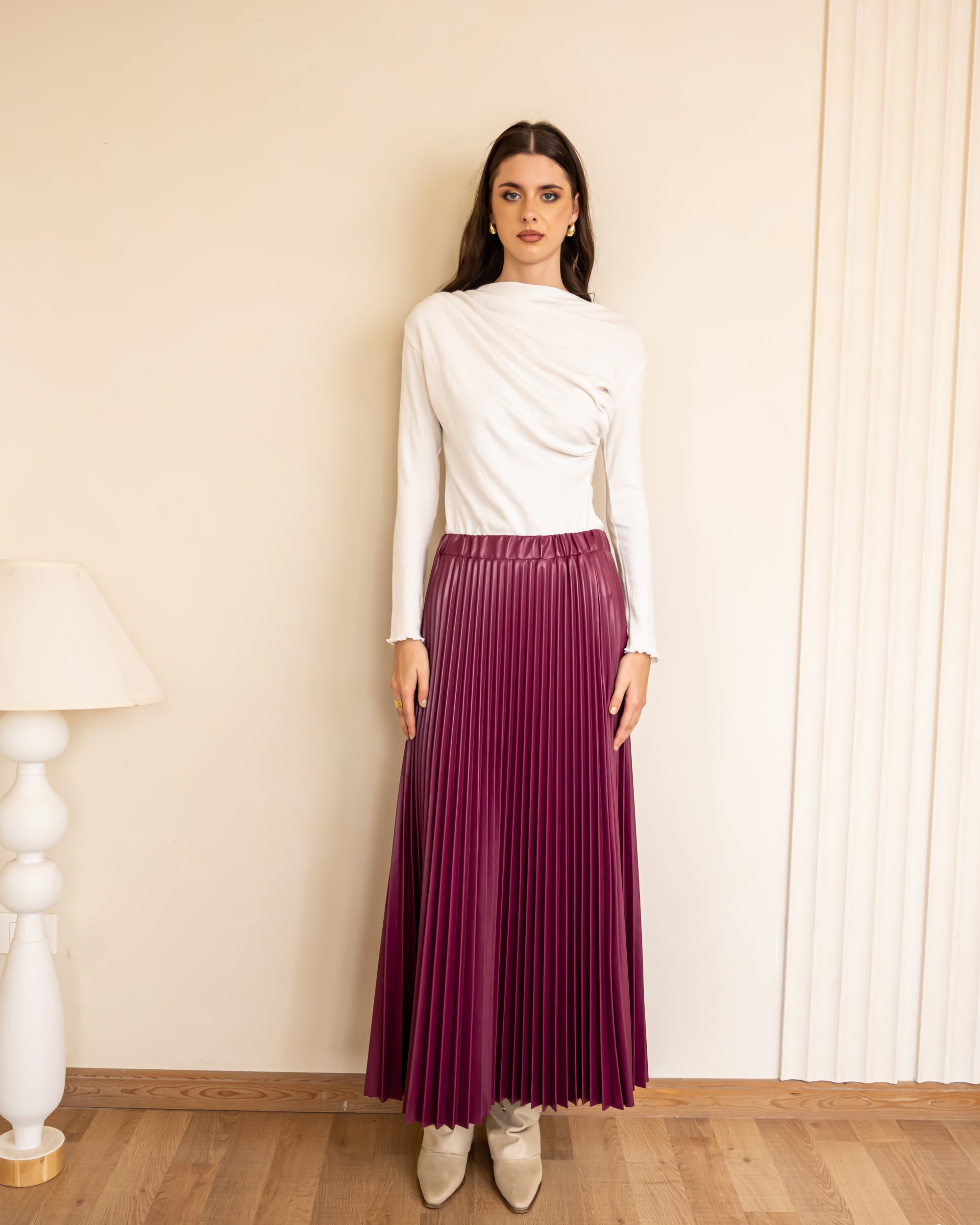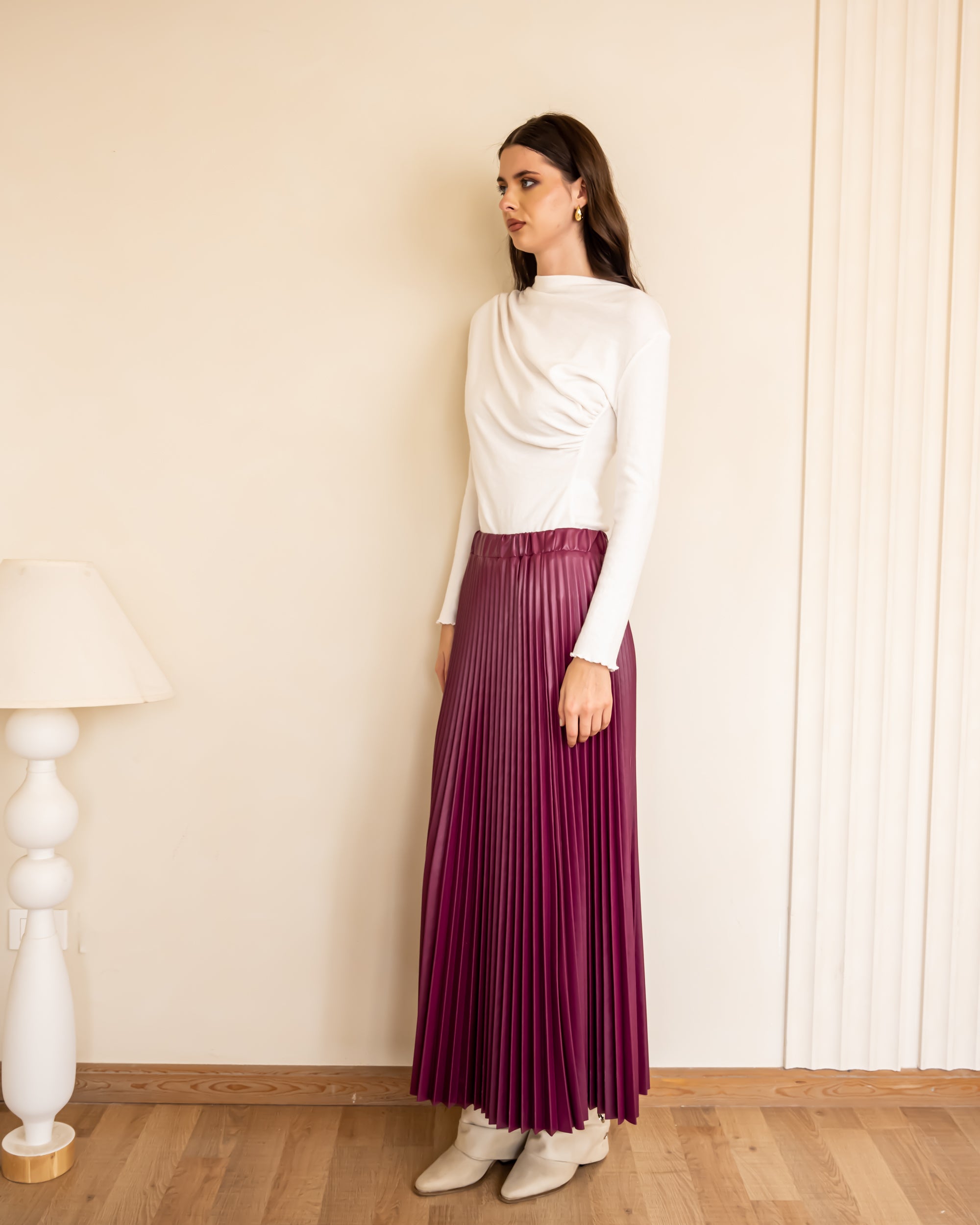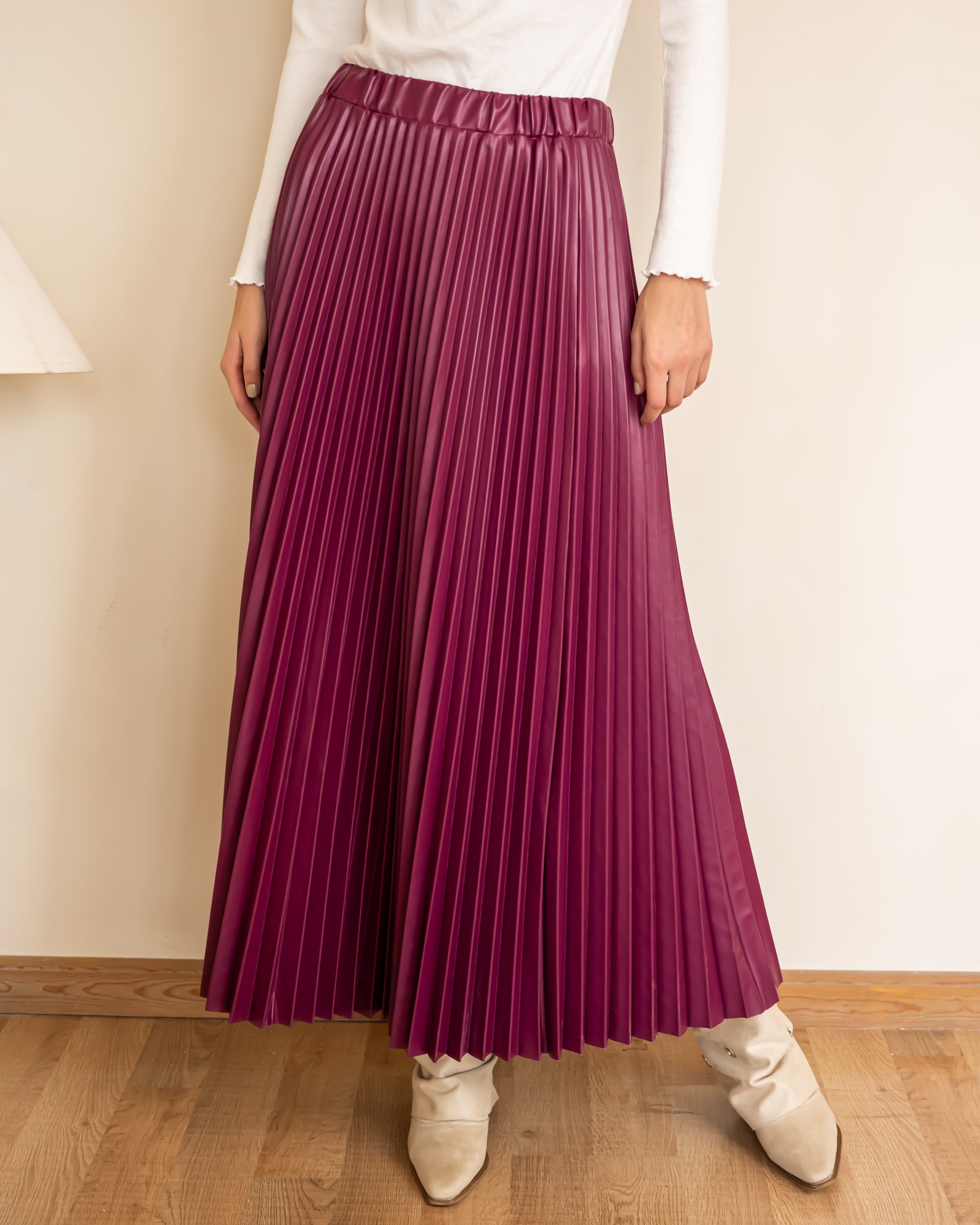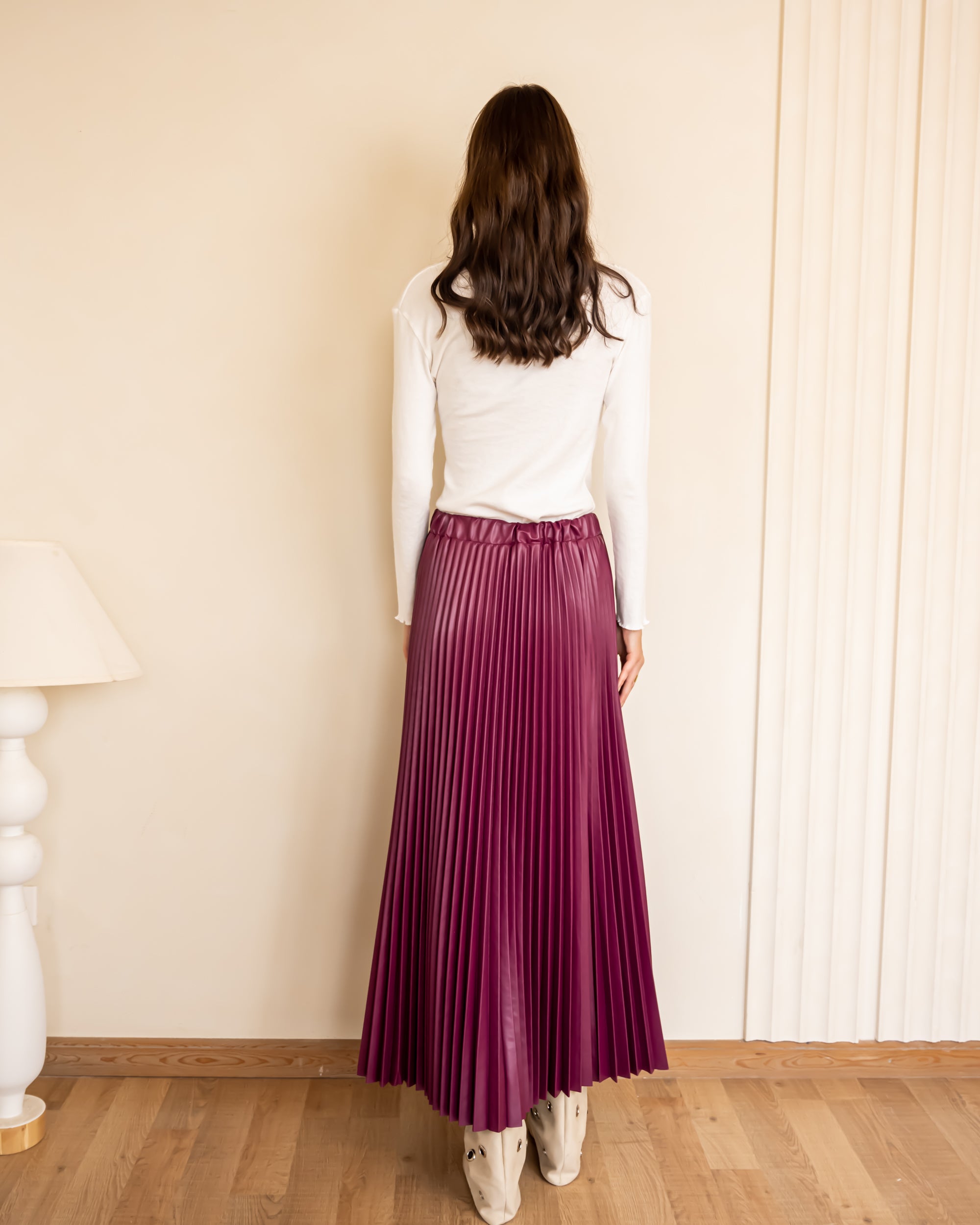 LEATHER PLISSE SKIRT-Burgundy