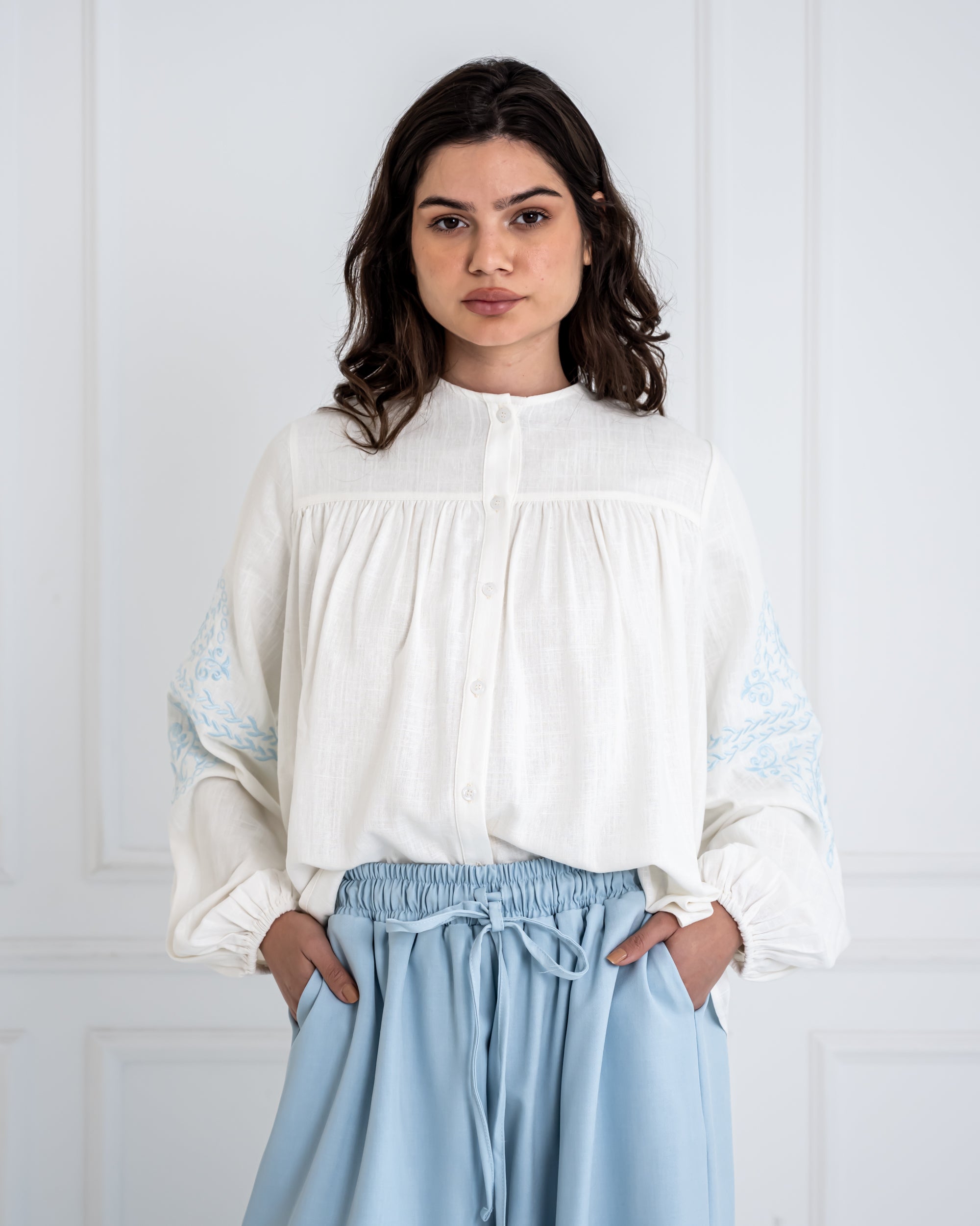 This off-white linen blouse features intricately embroidered sleeves, adding a touch of elegance to any outfit. Made with lightweight and breathable fabric, it is perfect for warmer days. Elevate your style with this versatile and stylish piece.