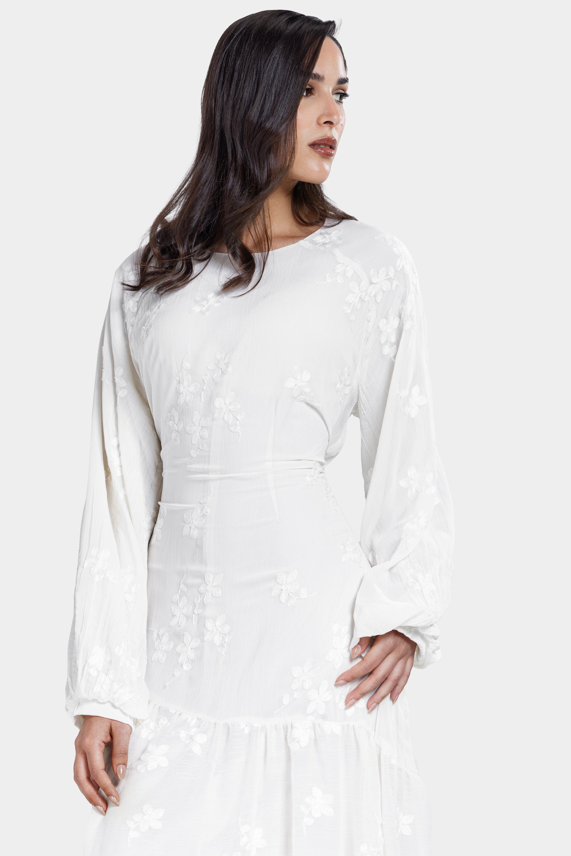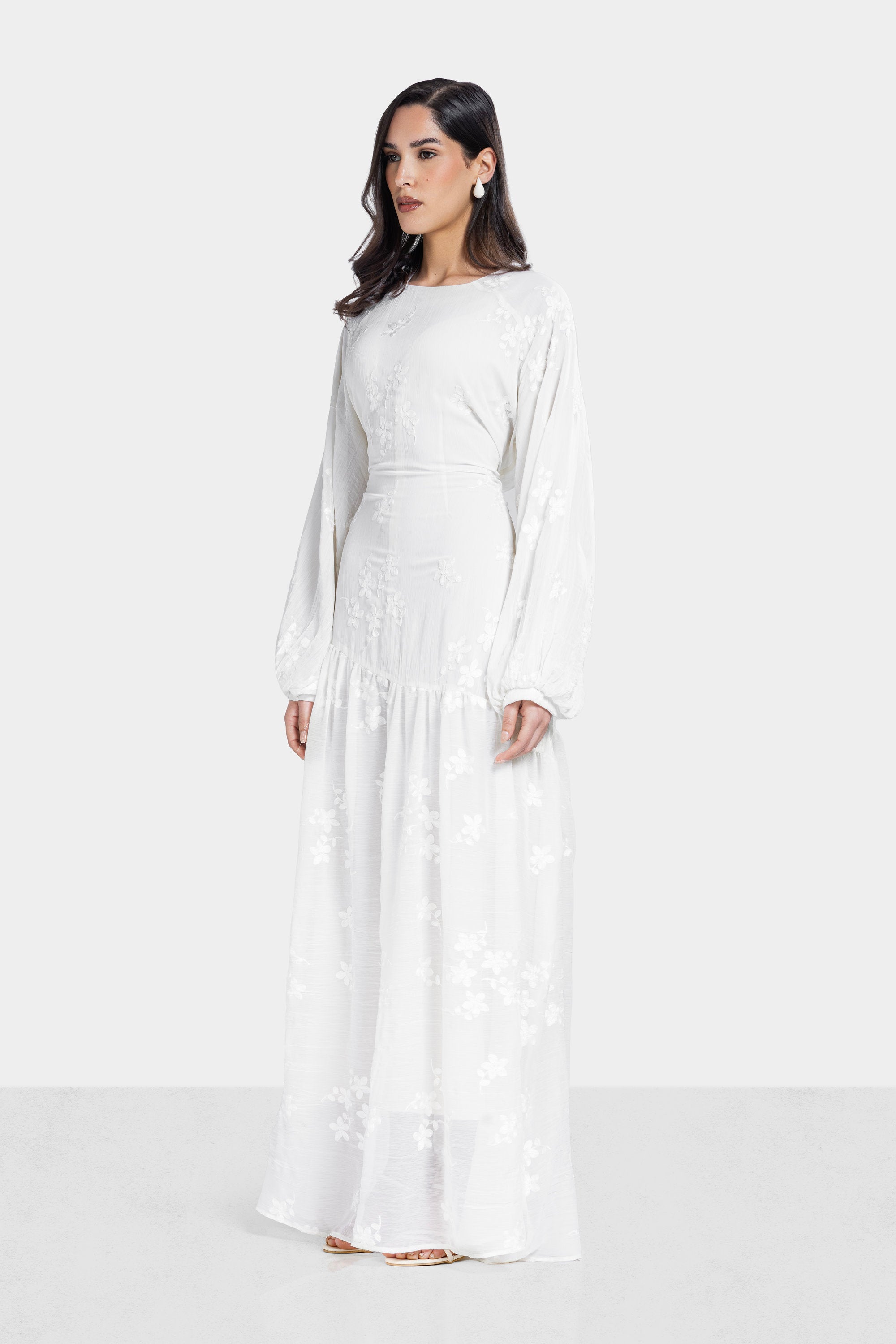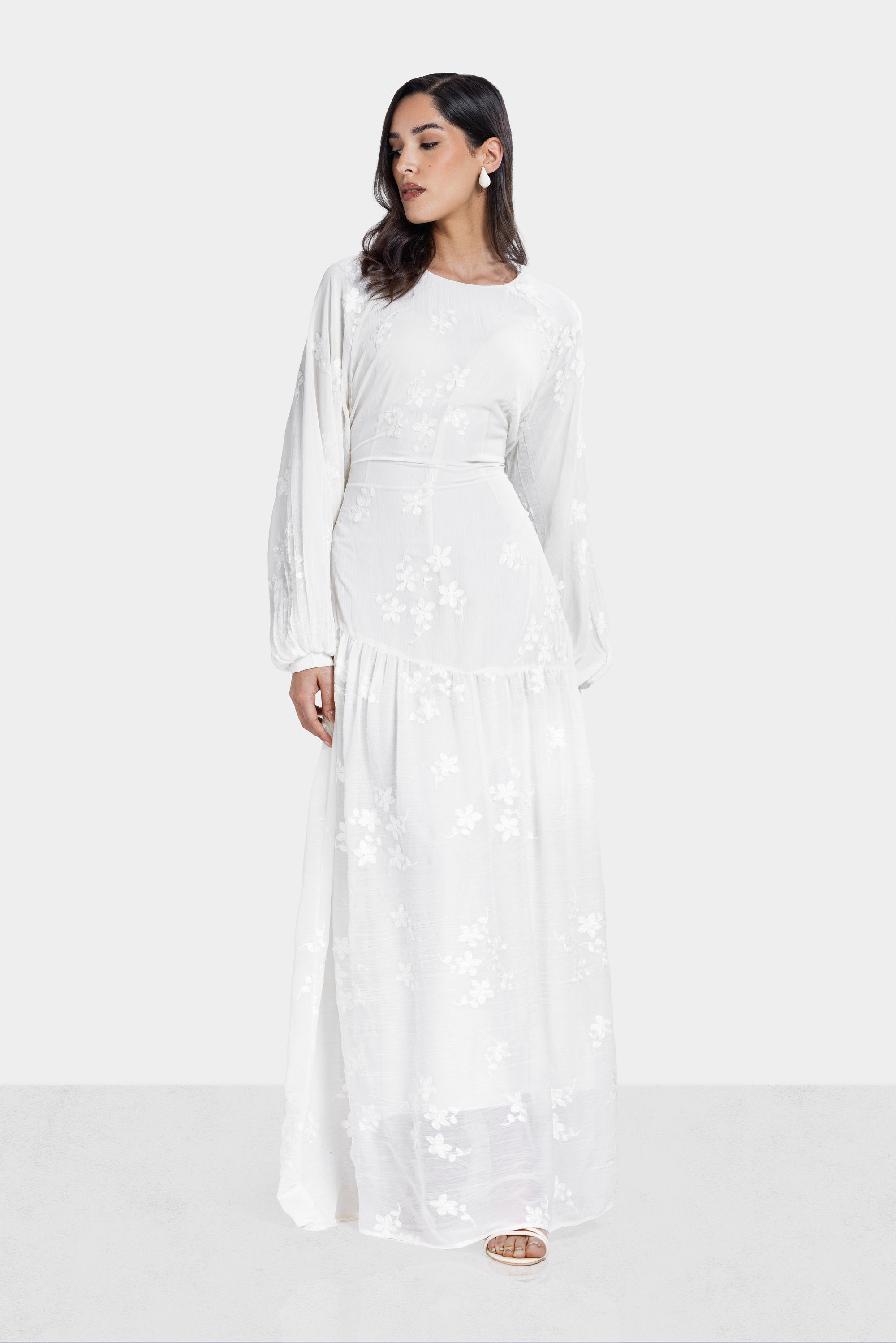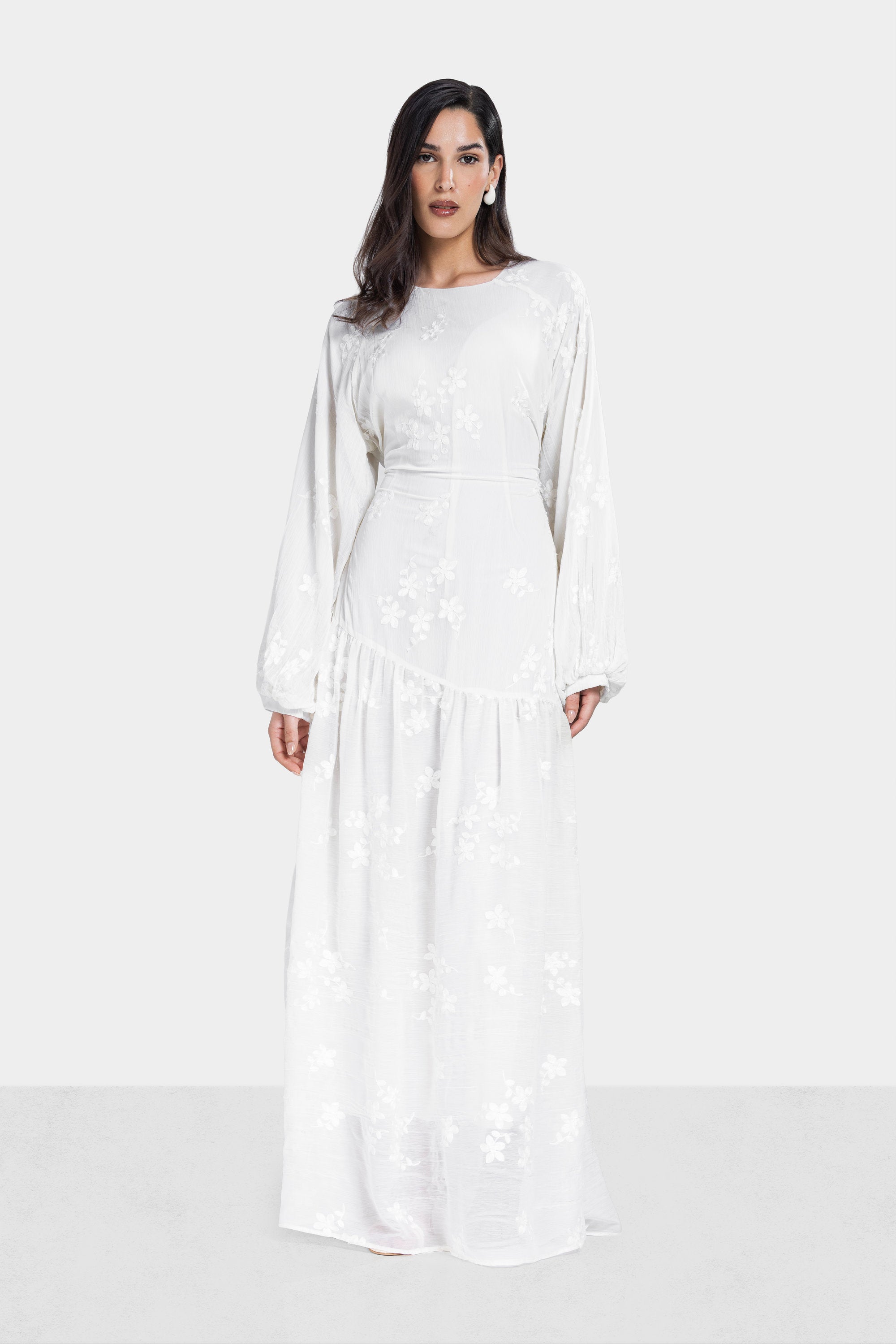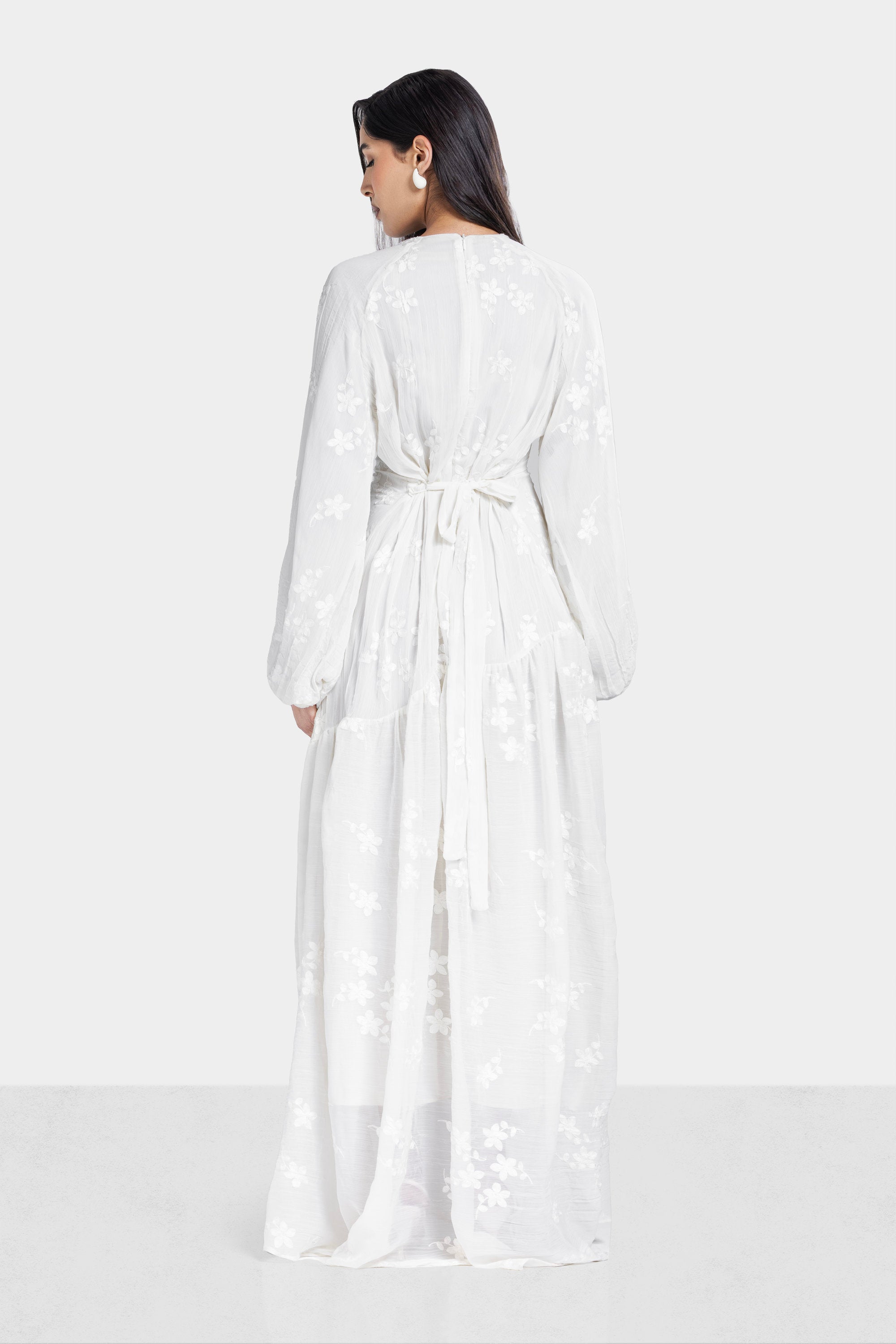 An elegant full-length piece designed with delicate embroidery and soft crinkled texture. The flowing chiffon silhouette creates graceful movement with a refined feminine finish.