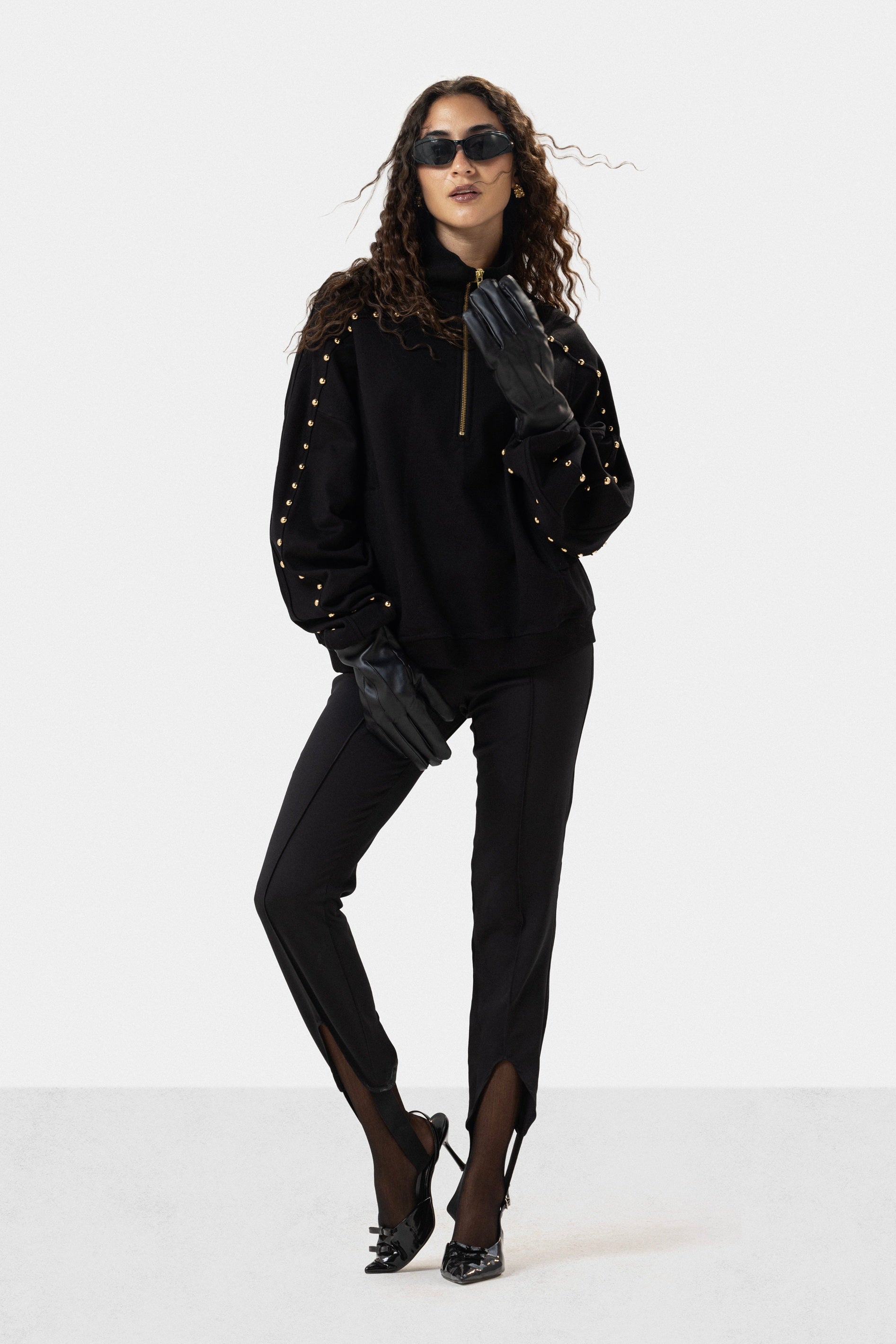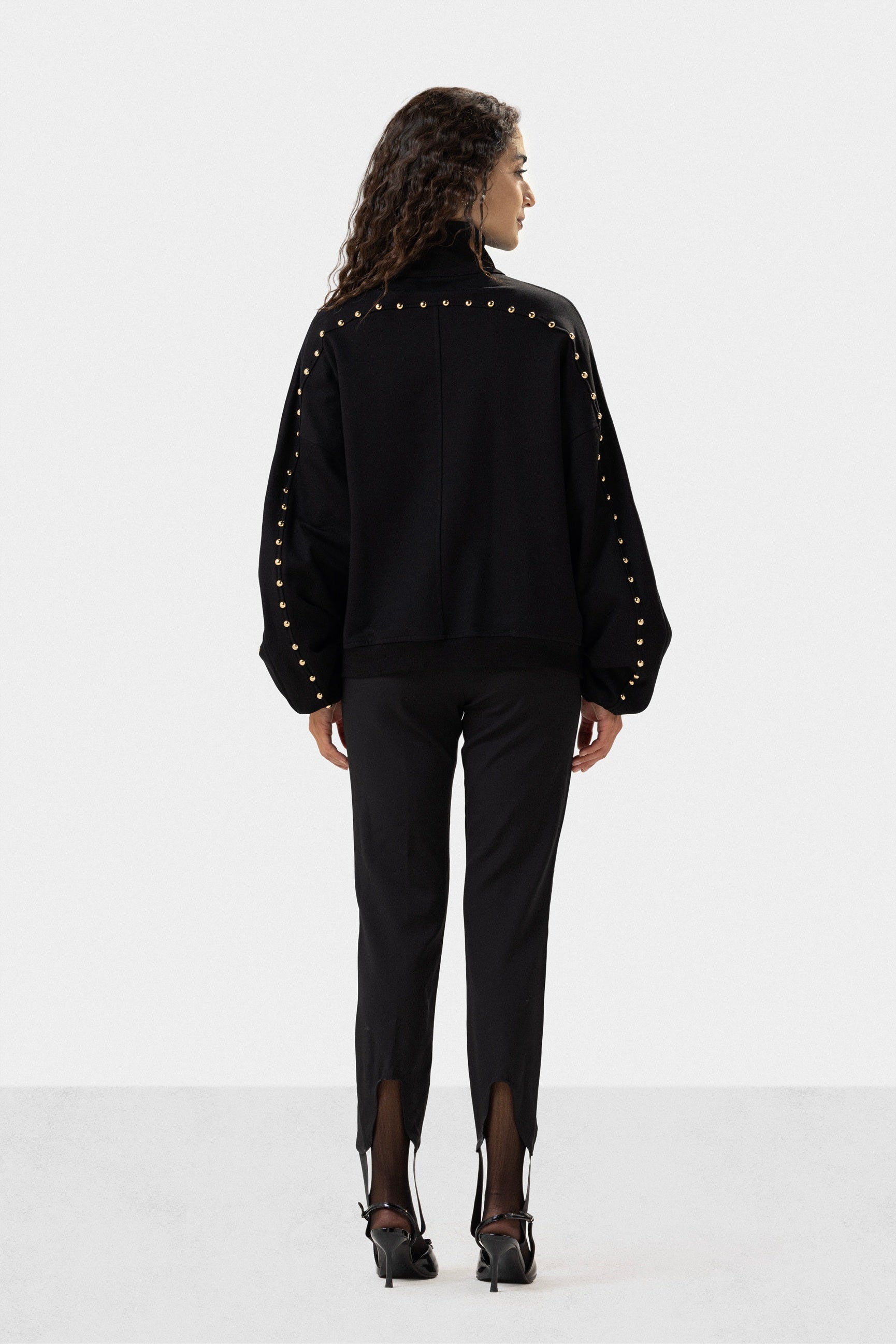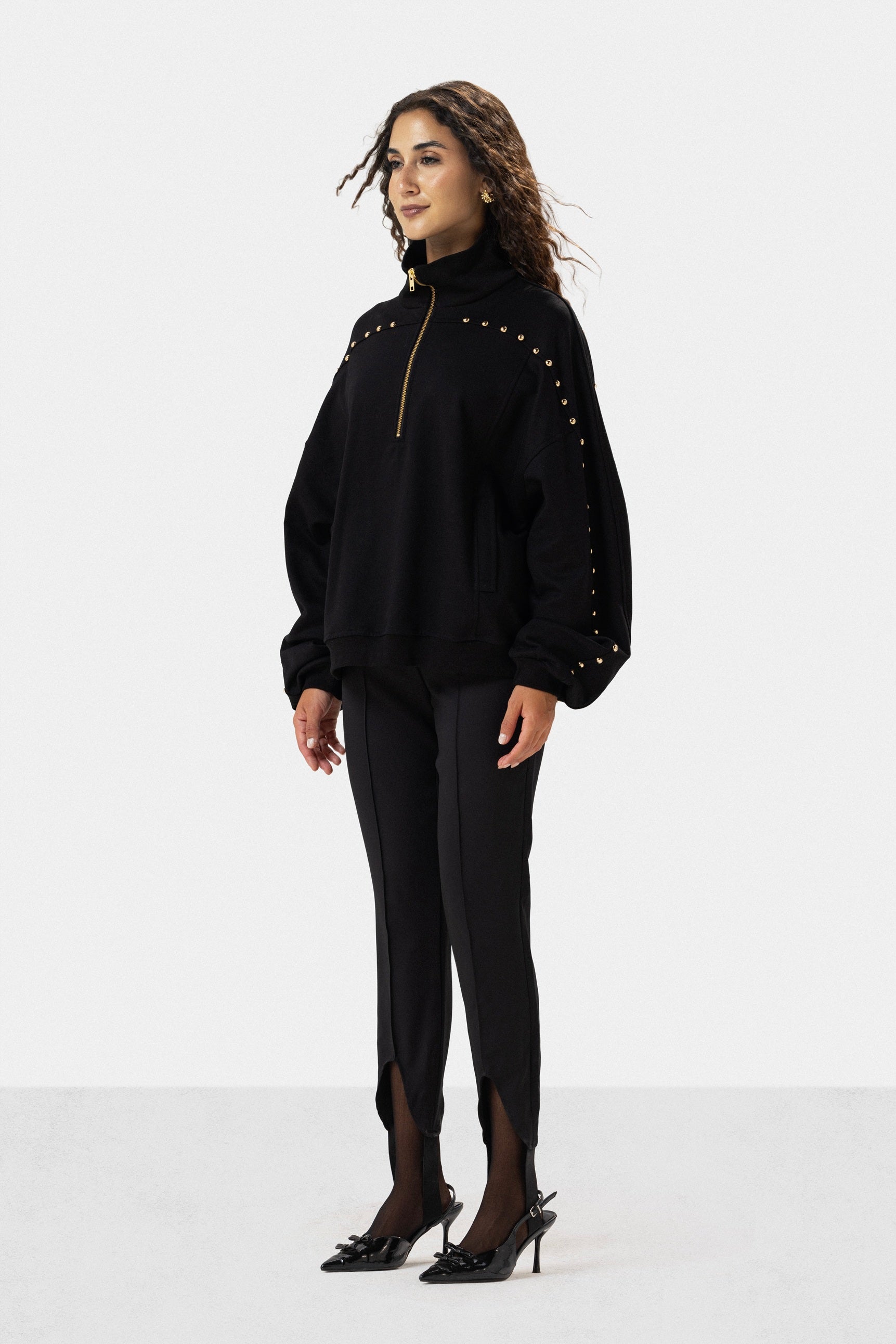 The Studded Sweat Shirt combines comfort with a subtle edgy touch. Its relaxed silhouette is elevated with metallic studs running along the sleeves and shoulders, creating a clean yet distinctive design detail. The half-zip neckline adds versatility and ease, making it suitable for casual outings, layering, or everyday wear. Ribbed cuffs and hem provide structure while maintaining softness and comfort.